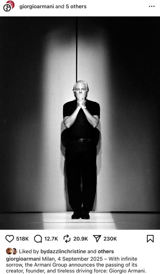 The Armani Group made an Instagram post, officially announcing the death of iconic fashion designer Giorgio Armani, on Thursday, September 4. (Courtesy of IG/@giorgioarmani)