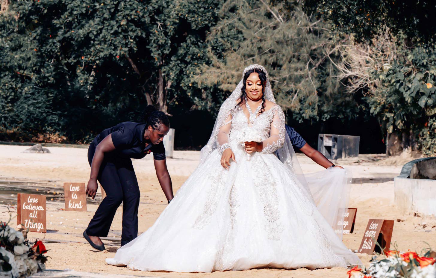 The train of Shanika’s besopke Ese Azenabor ball gown is adjusted by a member of the Tropical Weddings Jamaica team. (Photo: Tool Cool Photography)