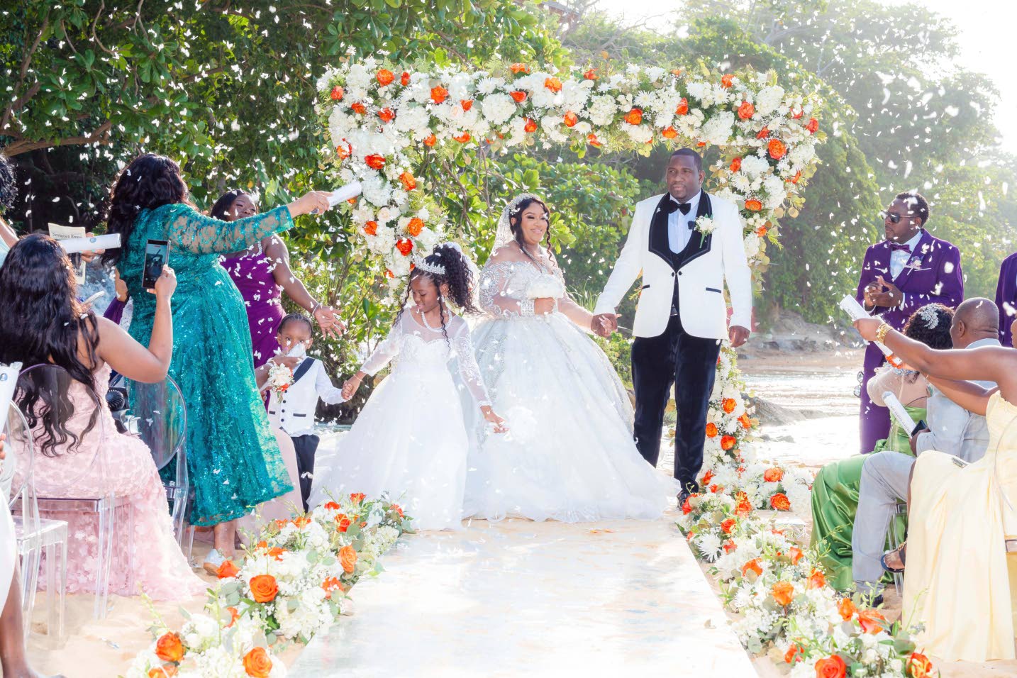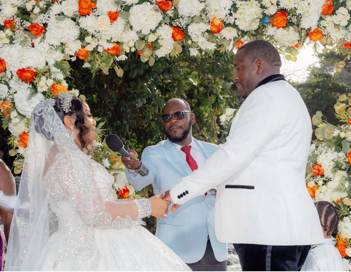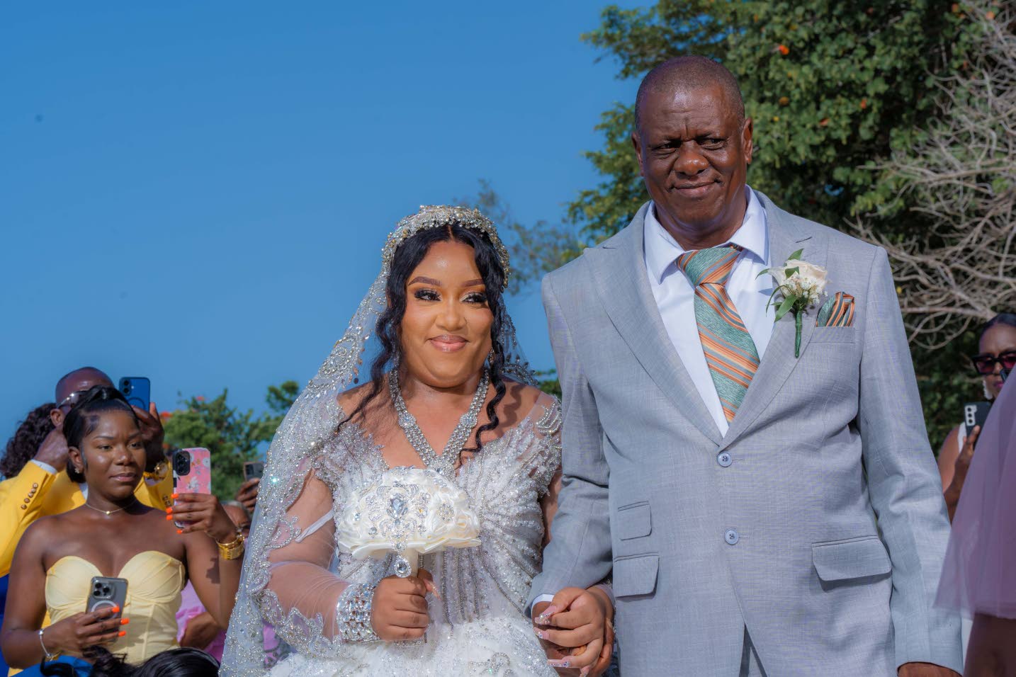 Months later, Sanika, escorted by her father, Albert Ingram, wowed in a bespoke Ese Azenabor ball gown as she commenced her walk up the aisle, in a setting curated by Tropical Weddings Jamaica, to Giving Myself by Jennifer Hudson. Waiting for her was Lemarr, dapper in a white and black tuxedo, ready to exchange vows under the guidance of Pastor Stenneth Davis.