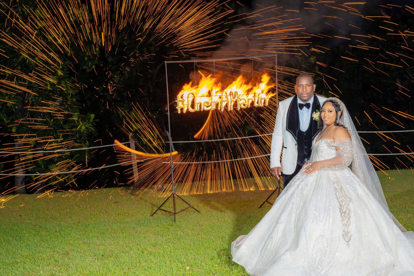 The reception continued at the same venue with gourmet fare by Junior Francis Catering. Memorable moments included were a poignant father-daughter dance, and a blazing fire dance performance. The newly-weds cut their three-tiered vanilla, coconut and Jamaican fruitcake provided by Tropical Weddings Jamaica before they opened the dance floor, celebrating their union to Beyonce’s Hands II Cater (Wedding Edition). DJ Shem then took over with a high-energy set that invited guests to celebrate the night away.