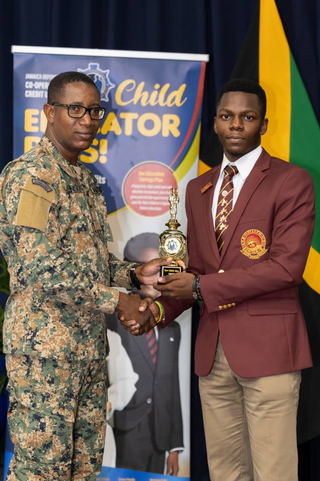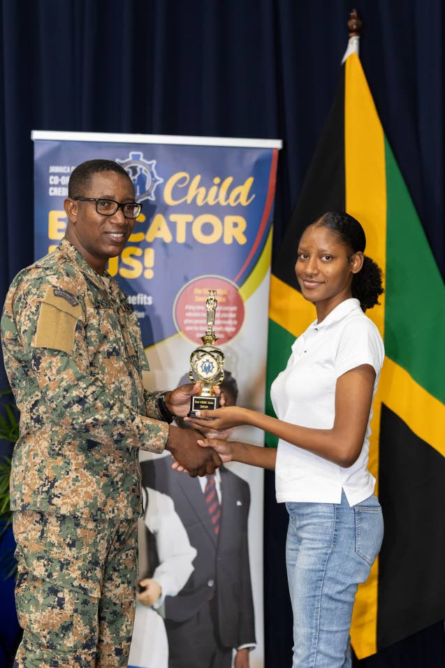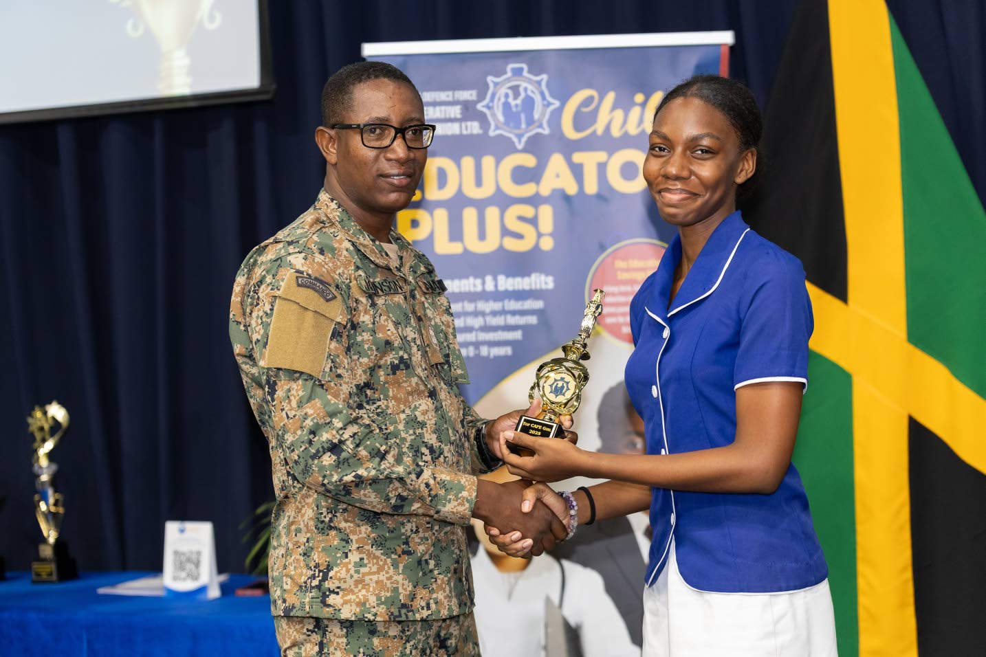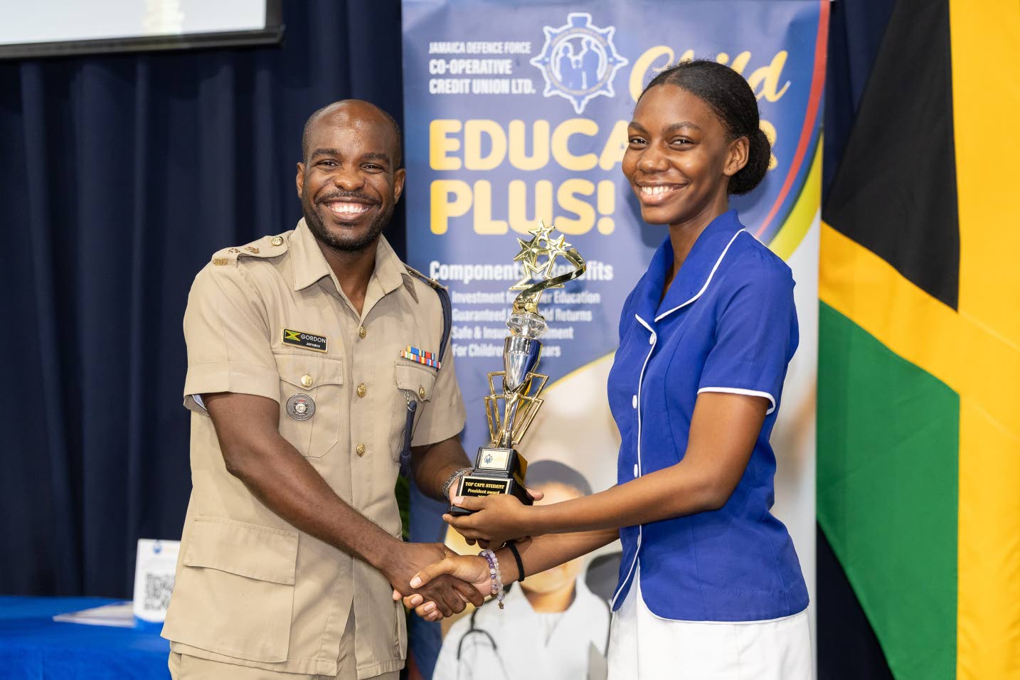 JDF Co-op Credit Union President Lt Col Maxwell Gordon presents the President’s Award to the Top CAPE student Kalea Henry.