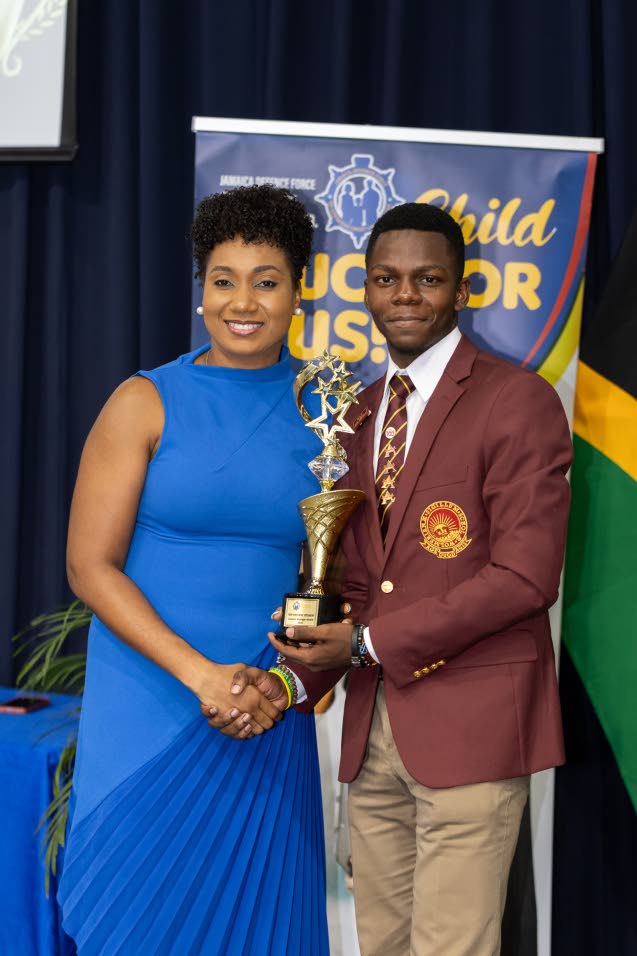 JDF Co-op Credit Union 1st Vice-President WO2 Shelroy Johnson presents the Top CSEC/CXC Girl trophy to Asia’h Duckie.