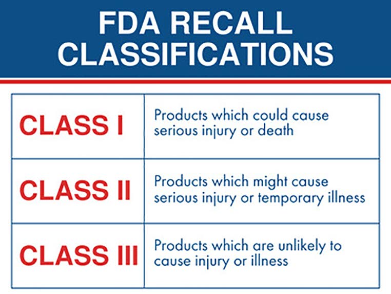 • Class I – The most serious type. These involve products that could cause serious health problems or death if consumed. Examples include foods contaminated with deadly pathogens like Listeria or undeclared allergens such as peanuts.
