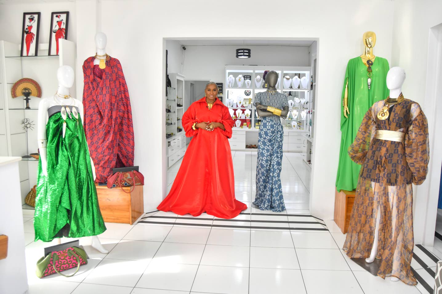 Pride of Place L Deean Fontaine, proprietor, EtAl boutique, stands alongside a few pieces from the Nigerian Wanni Fuga collection available exclusively at EtAl. Naphtali Junior