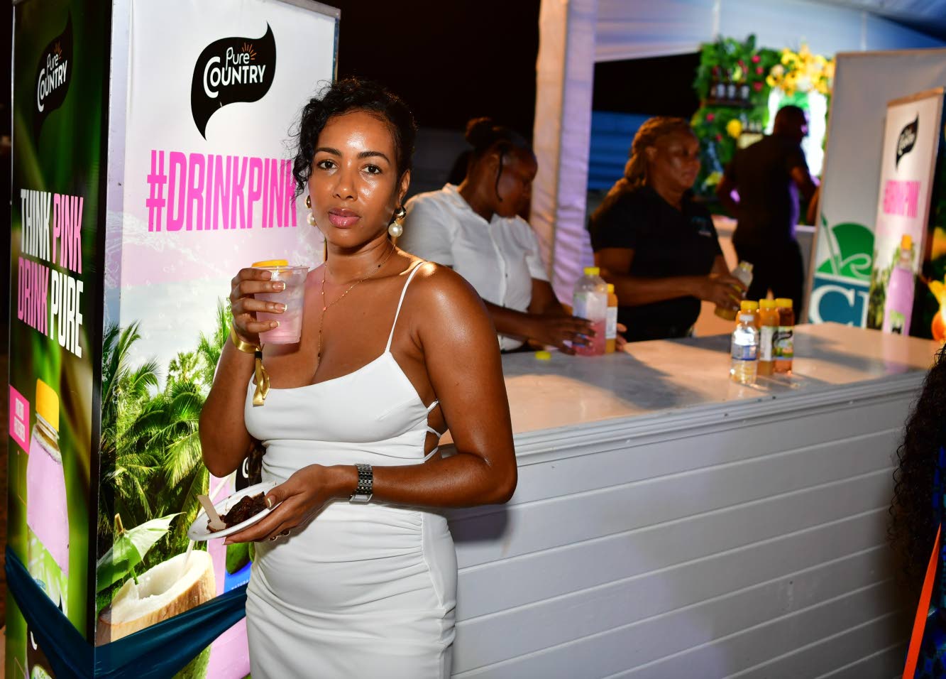 Tina Hylton, owner, DMS Clothing, quenched her thirst with coconut water from the Pure Country station. Aceion Cunningham