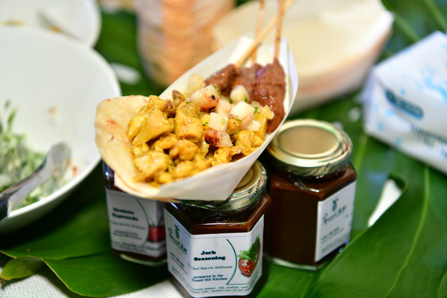 Curried chicken, jerk lamb koftas, roti with pineapple chutney and charred pineapple salad from Round Hill Hotel and Villas Aceion Cunningham