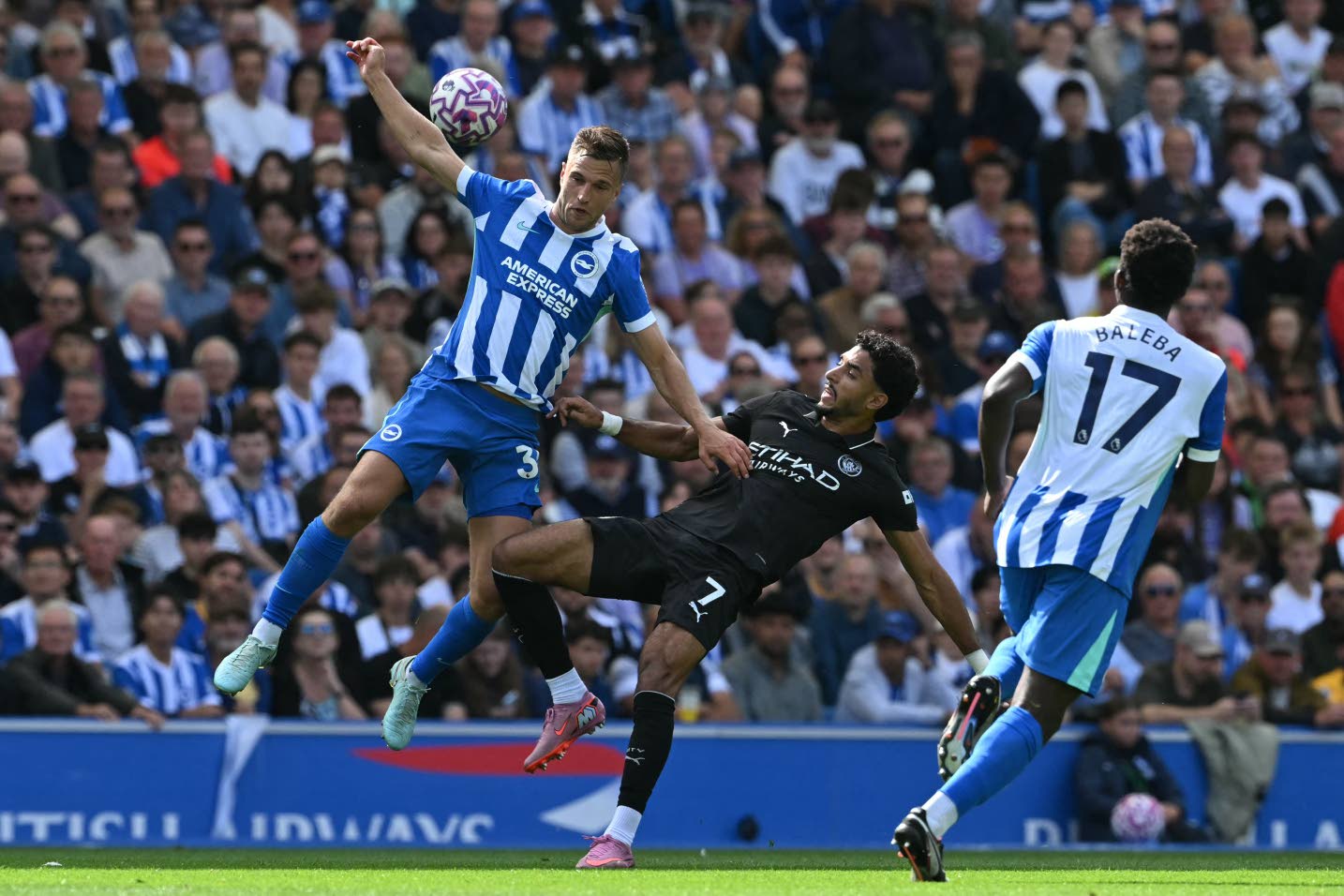 Brighton’s Dutch defender Joel Veltman (left) vies with Manchester City’s Egyptian striker Omar Marmoush (centre) during the English Premier League football match between Brighton and Hove Albion and Manchester City at the American Express Community Stadium in Brighton, southern England, on August 31, 2025. AFP