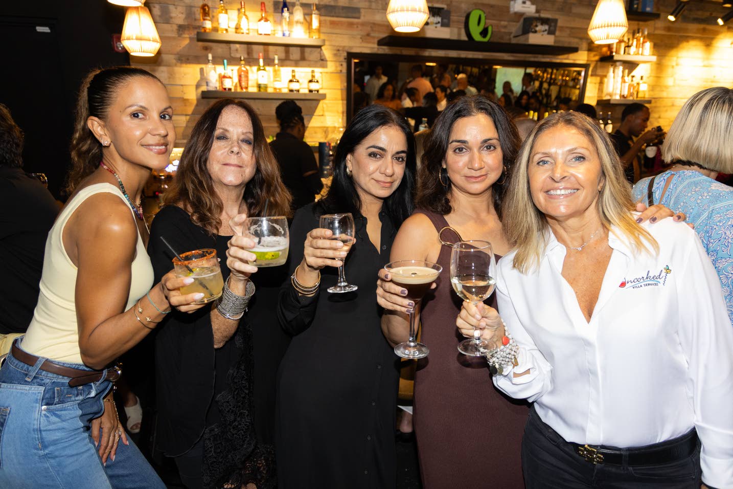 Sip, Sip, Hooray! From left: MaisonThrift owner Julie Kling; Couples Resorts PR Director Alex Ghisays; Resortwear owner Indra Chandiram; Cool Gear owner Asha Issa; and Uncorked Villa Services Manager Sabrina Russell raised a glass to the evening.