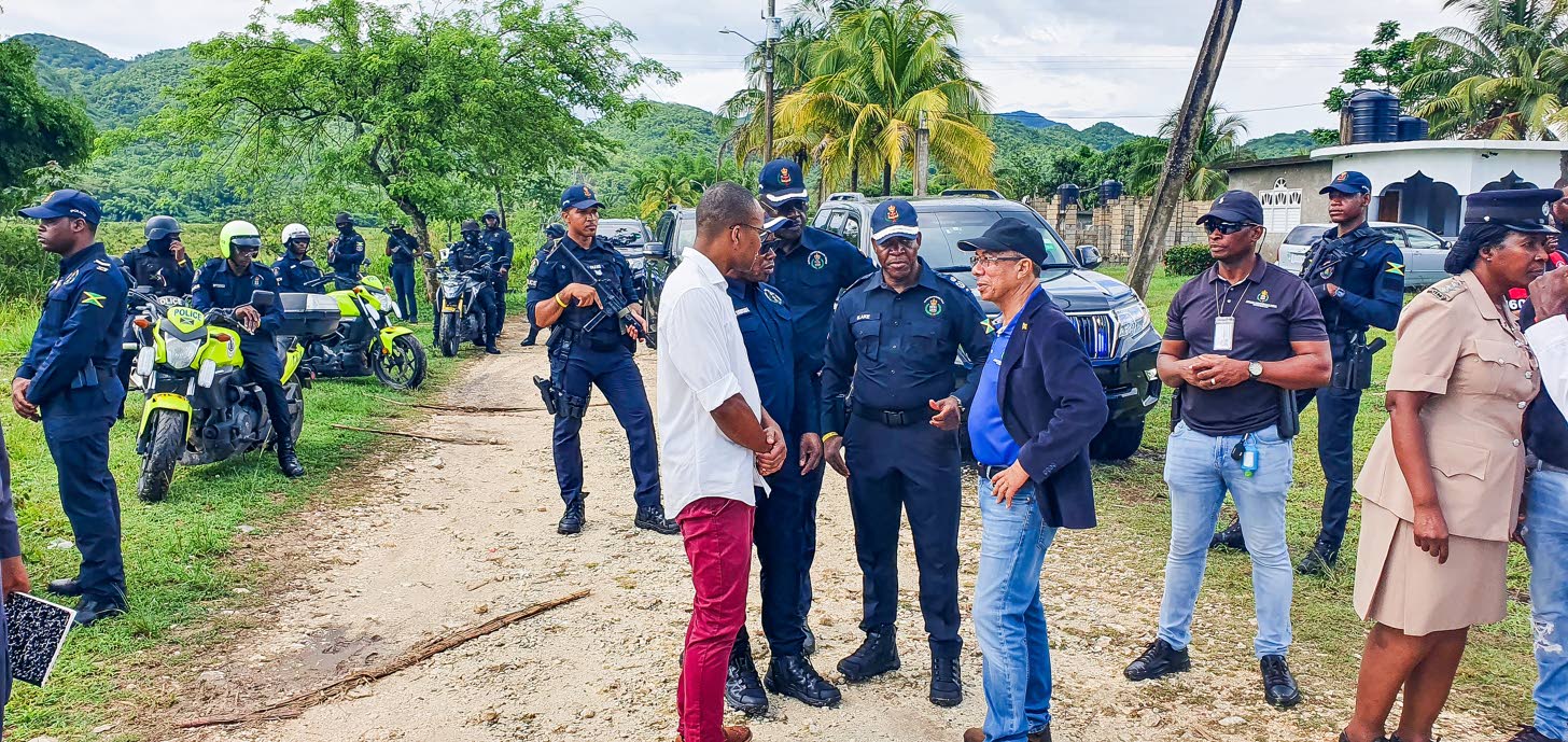 In this 2024 file photo, then Member of Parliament for Westmoreland Western Morland Wilson (white shirt) and National Security Minister Dr Horace Chang (third right) listen to Commissioner of Police Dr Kevin Blake during a tour of the Kings Valley community in Westmoreland. (Photo: Anthony Lewis)