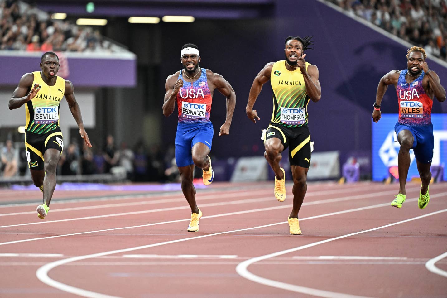 From left: Oblique Seville of Jamaica, Kenneth Bednarek of the United States, Kishane Thompson of Jamaica, and Noah Lyles of the United States compete in the men’s 100m final during the World Athletics Championships in Tokyo, Japan, on Sunday. (Photo: AFP)