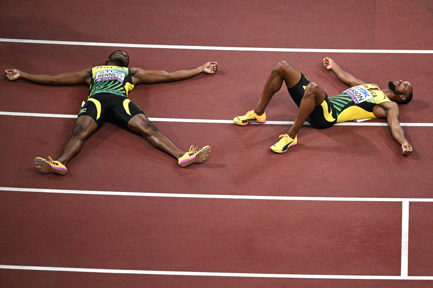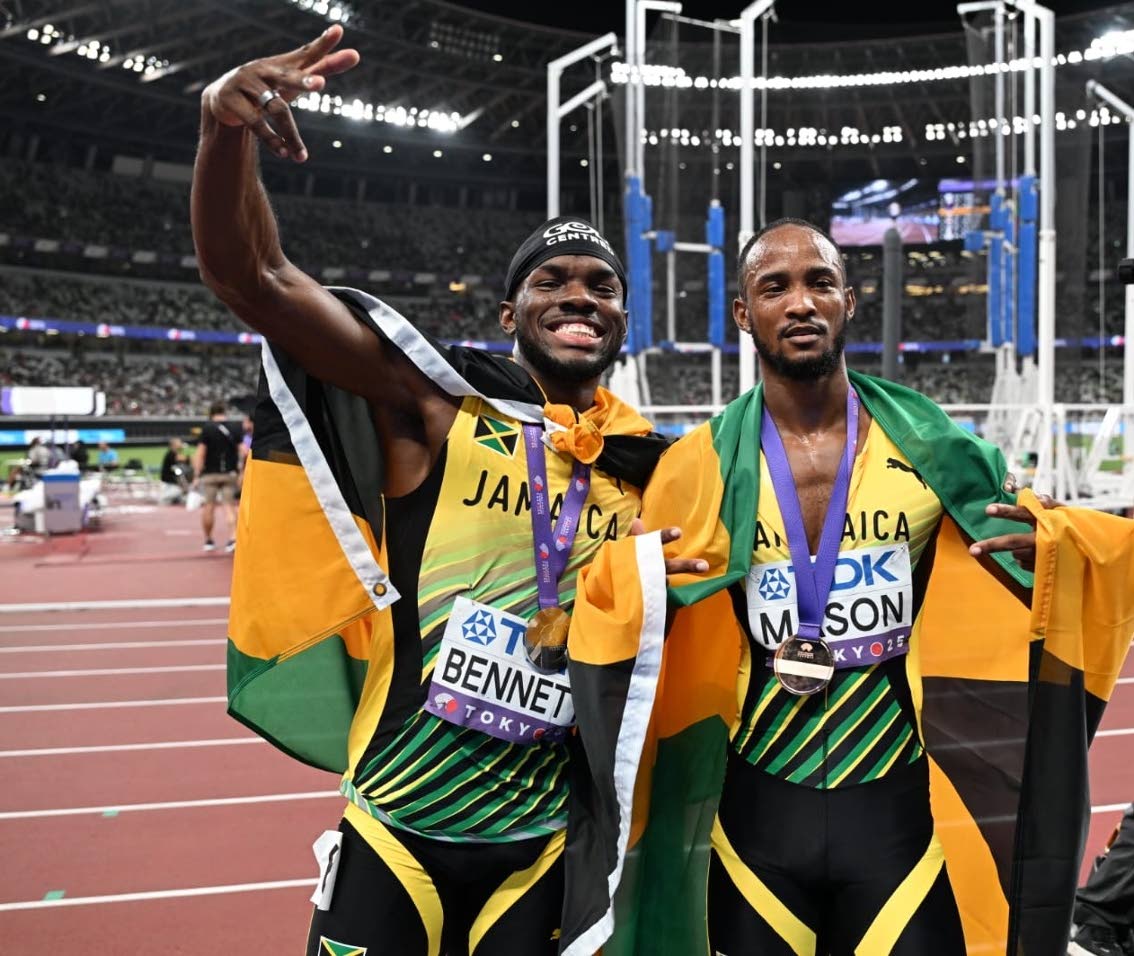The Jamaican pair of Orlando Bennett (left) and Tyler Mason react to the men’s 110m hurdles final during the World Athletics Championships in Tokyo, Japan, on Tuesday. (Photo: AFP)