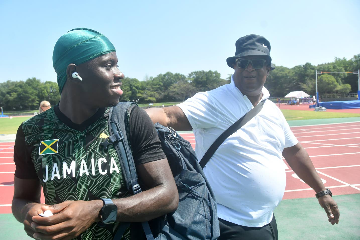 Jamaica’s freshly minted 100m gold medallist Oblique Seville (left) exchanges pleasantries with athletics coach Stephen Francis in Tokyo, Japan. Photo: Garfield Robinson
