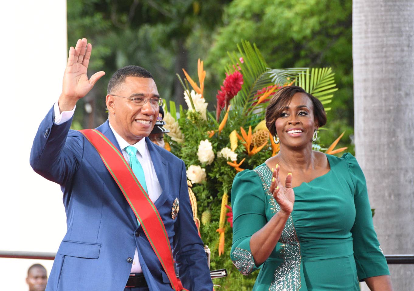 Prime Minister Dr Andrew Holness and wife Juliet wave to guests as they arrive for his swearing-in cermony on Tuesday at King’s House in St Andrew. (Photo: Joseph Wellington)
