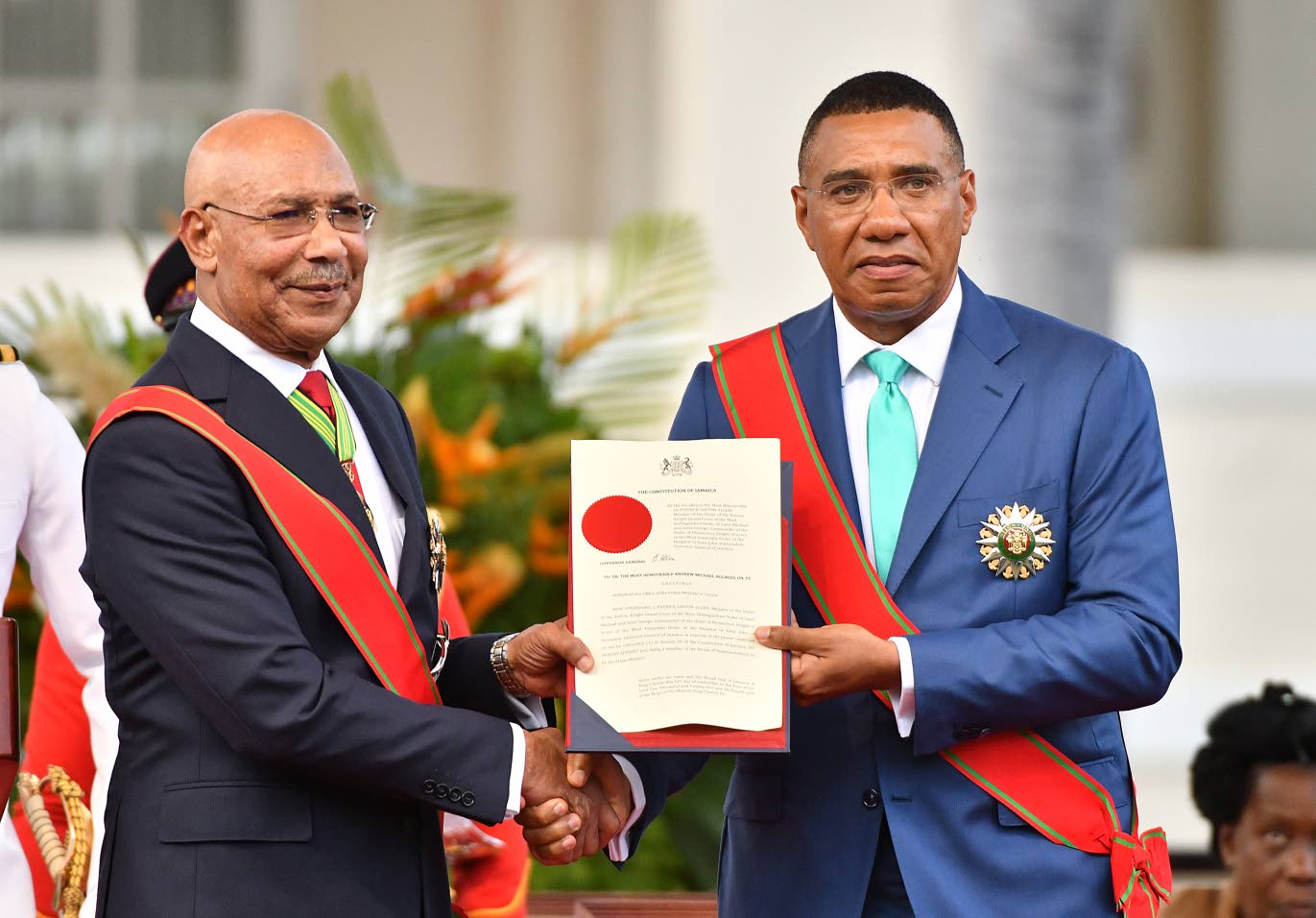 Governor General Sir Patrick Allen (left) presents the Instrument of Appointment to Prime Minister Dr Andrew Holness on Tuesday at King’s House. (Photo: Naphtali Junior)