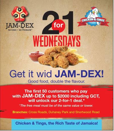 As part of the campaign launched last week, Chicken and Tings is offering customers a free additional meal when they pay using Jam-Dex on Wednesdays. The promotion, branded under the slogan “Get it wid Jam-Dex! Good food, double the flavor,” applies to the first 50 customers who use Jam-Dex to pay up to $2,000 (including GCT). The free meal must be of equal or lesser value.