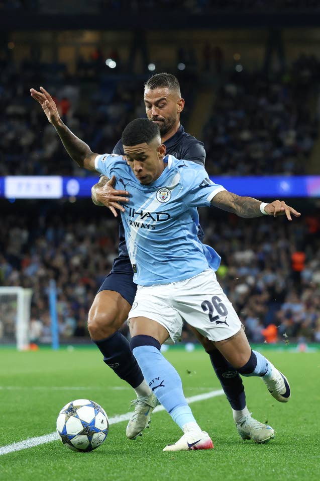 Manchester City’s Brazilian midfielder Savinho (right) and Napoli’s Italian defender Leonardo Spinazzola fight for the ball during the UEFA Champions League league stage football match between Manchester City and Napoli at the Etihad Stadium in Manchester, north-west England, on September 18, 2025. AFP