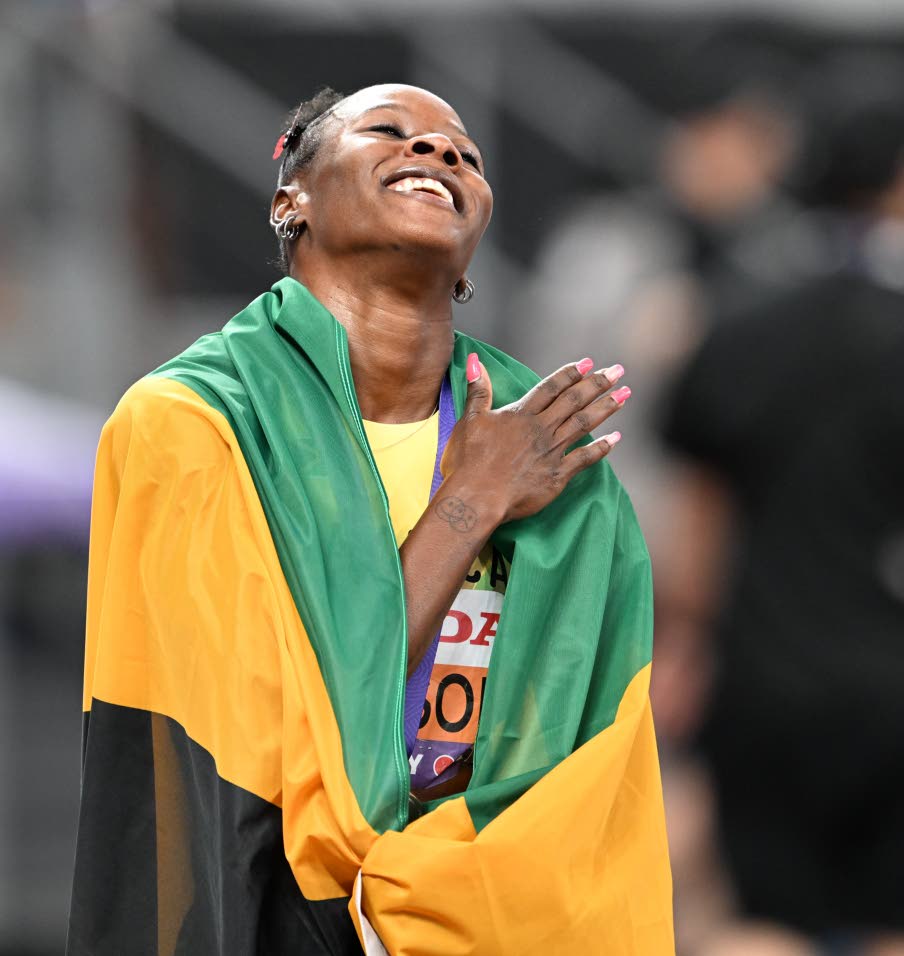 Shericka Jackson of Jamaica celebrates winning the bronze medal in the women’s 200m final race during the World Athletics Championships in Tokyo, Japan, on Friday. (Garfield Robinson)