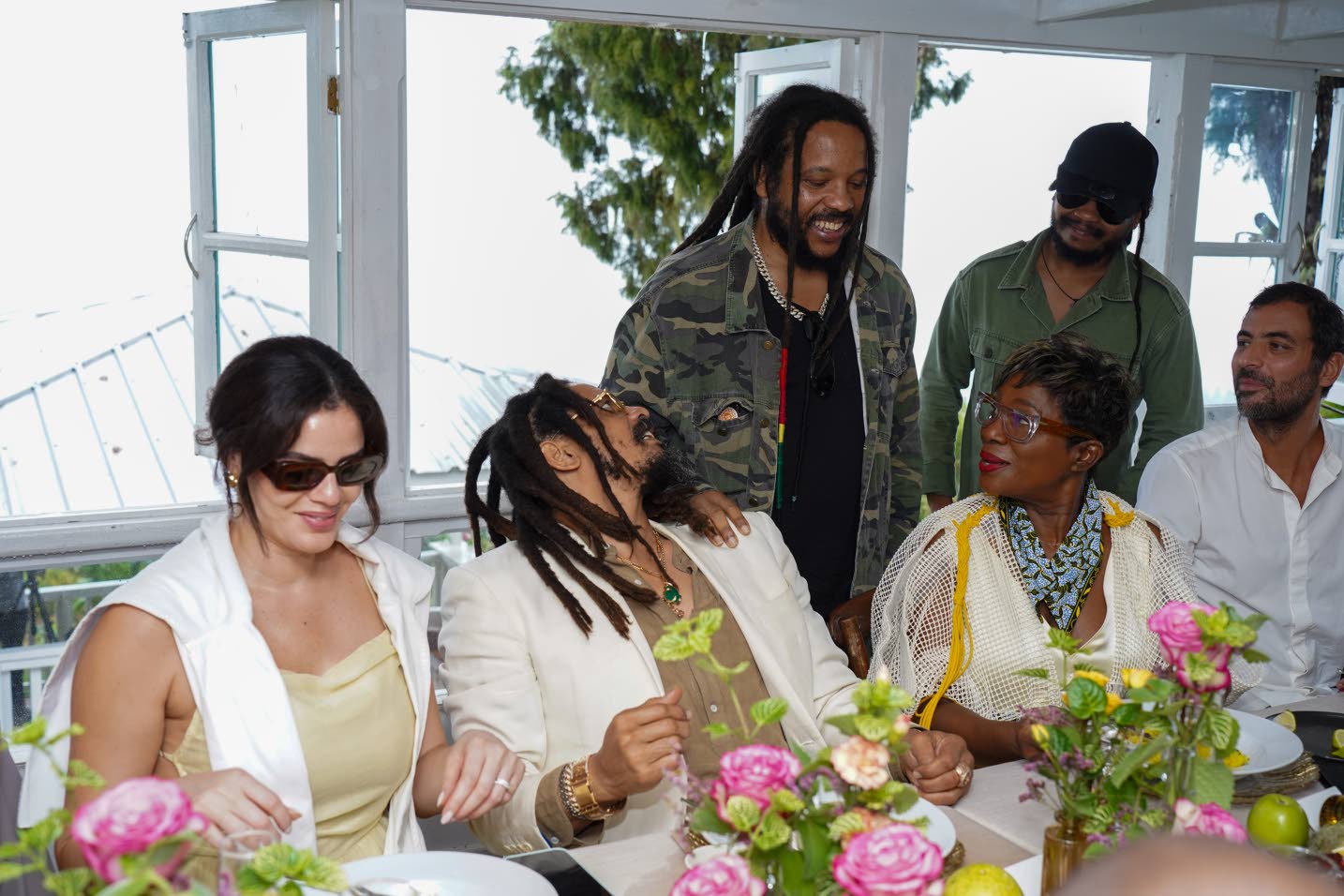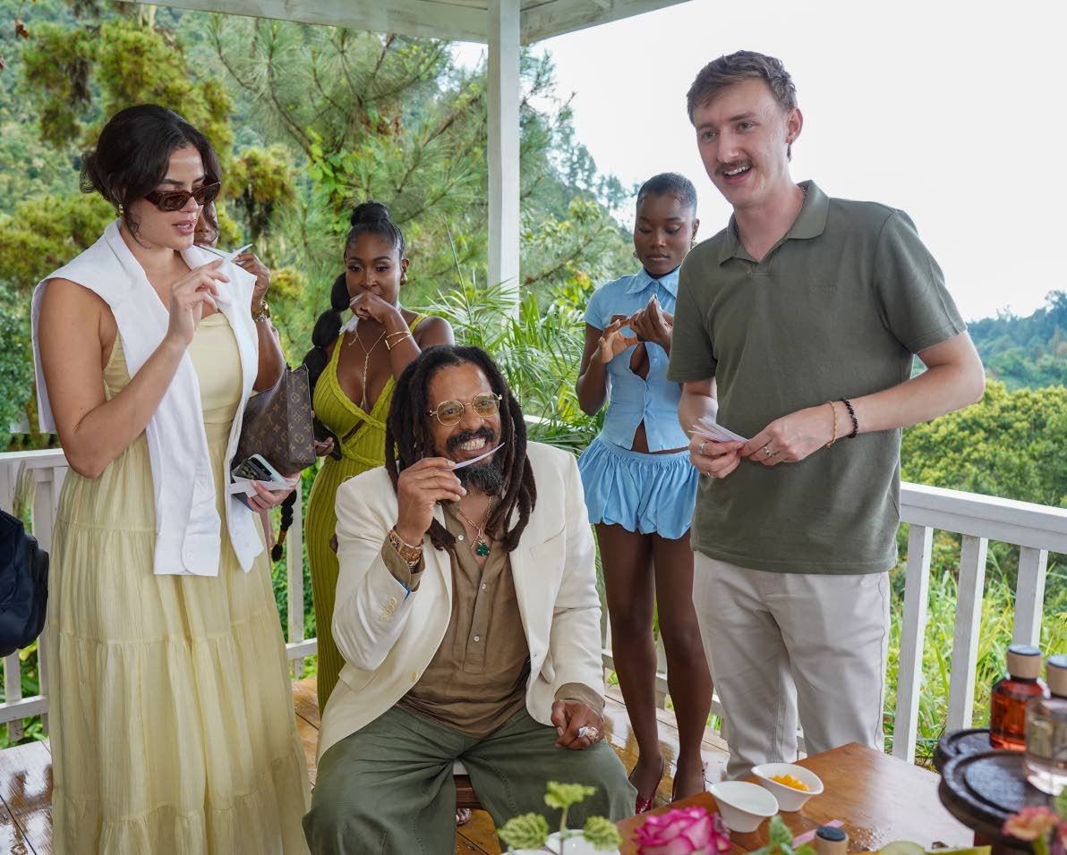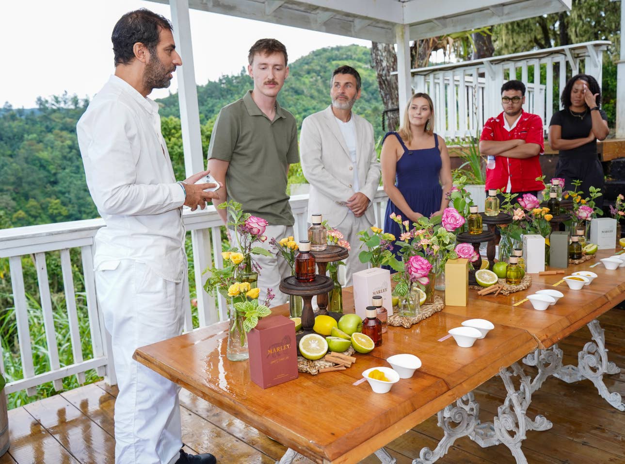 With rain forecast, many thought they would miss out on the sensory fragrance experience, set up on the café’s lower deck, but grey skies turned blue just long enough for them to explore the notes and nuances of each fragrance with the team of Gavarry — the nose behind Place of Peace Eau de Parfum, Larsen, Sebaoun, and Pierron. “We’re going to go through some of the ingredients that make these fragrances what they are. We have peace, unity, and love, all representing the values of the family and of the island, and really bringing the Bob Marley morals into what we’ve produced here today,” said Pierron as he pointed to the fragrances that had been separated in their respective groups on a tablescape beautifully decorated with the flora and fresh ingredients associated with scent. “Fortunately, we were able to work with very talented perfumers to bring that to life.”