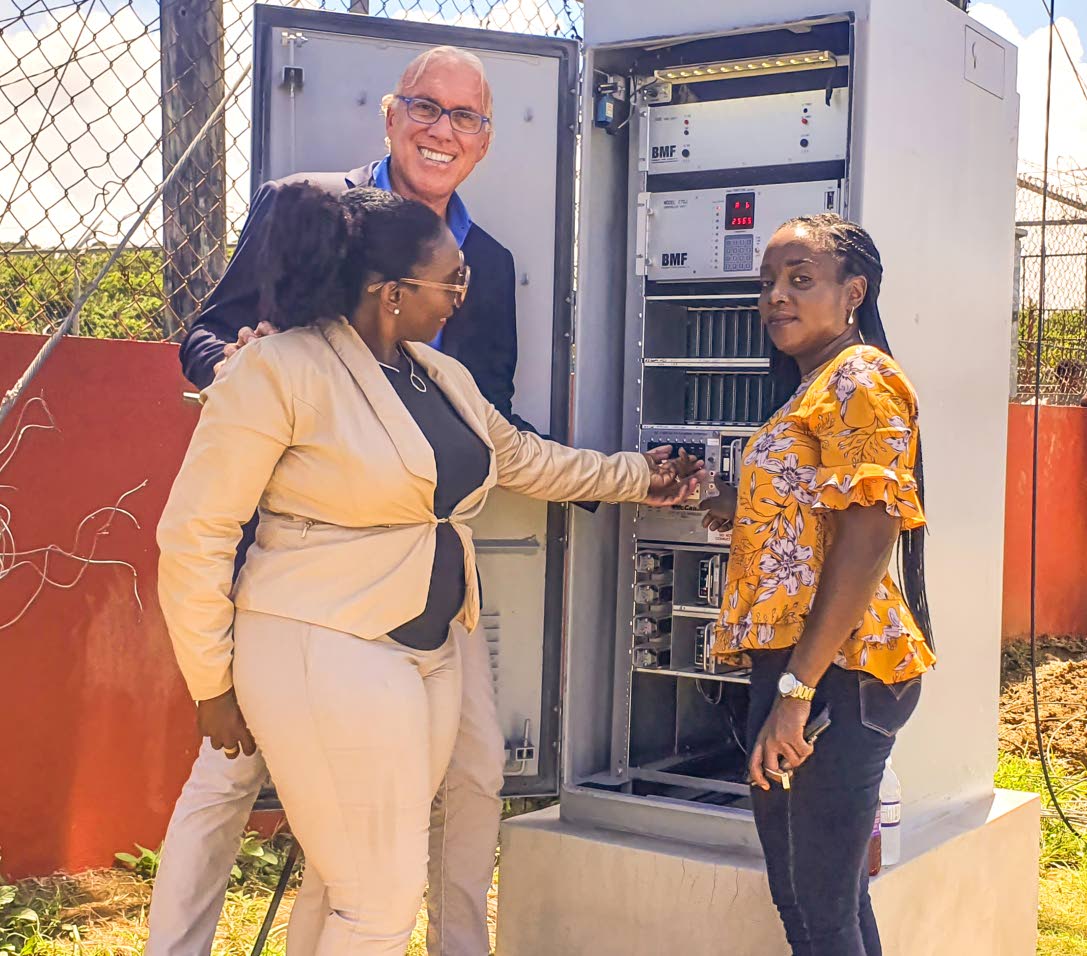 Member of Parliament for Hanover Western Heatha Miller Bennett (left) and community relations officer for the National Works Agency, Western Region, Janel Ricketts (right) looking at the new traffic signal control box at the entrance of Green Island High School in Hanover, while general manager of Princess Hotels and Resorts Enrico Pezzoli looks on.