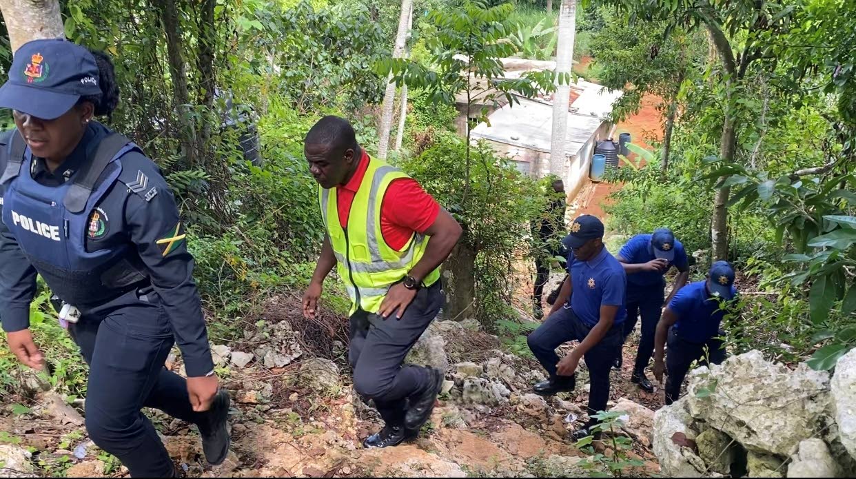 Members of the Jamaica Constabulary Force and Jamaica Fire Brigade searching a remote area off Perth Road in Mandeville for missing 12-year-old Jayden Smith on Tuesday. (Photo: Kasey Williams)