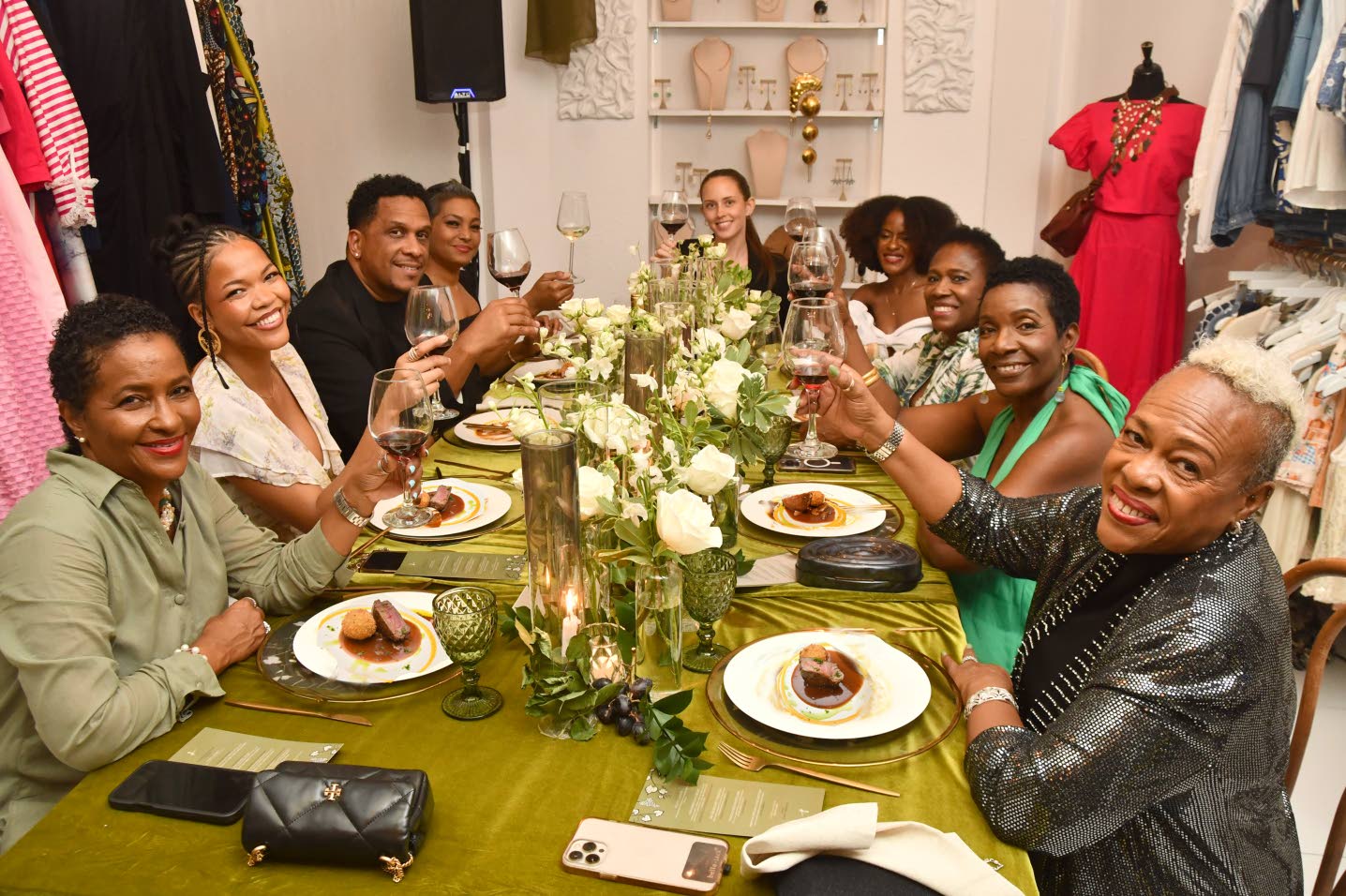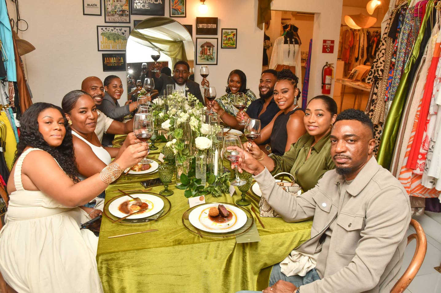 Raising a toast during the fifth course were guests at the ‘fun’ table (clockwise, from left) lecturer Suzanna Holness; songbird Elle; DJ Bambino; his wife, Puzzles by SG creator Shauna-Gaye Hart; brand development manager at Locale Chelseigh Buchanan; CPJ Corporate Wine Specialist Paula Bullings; attorney-at-law Delrose Campbell; landscape designer Annmarie Hylton; and businesswoman Valerie Marshall. (Photo: Naphtali Junior)