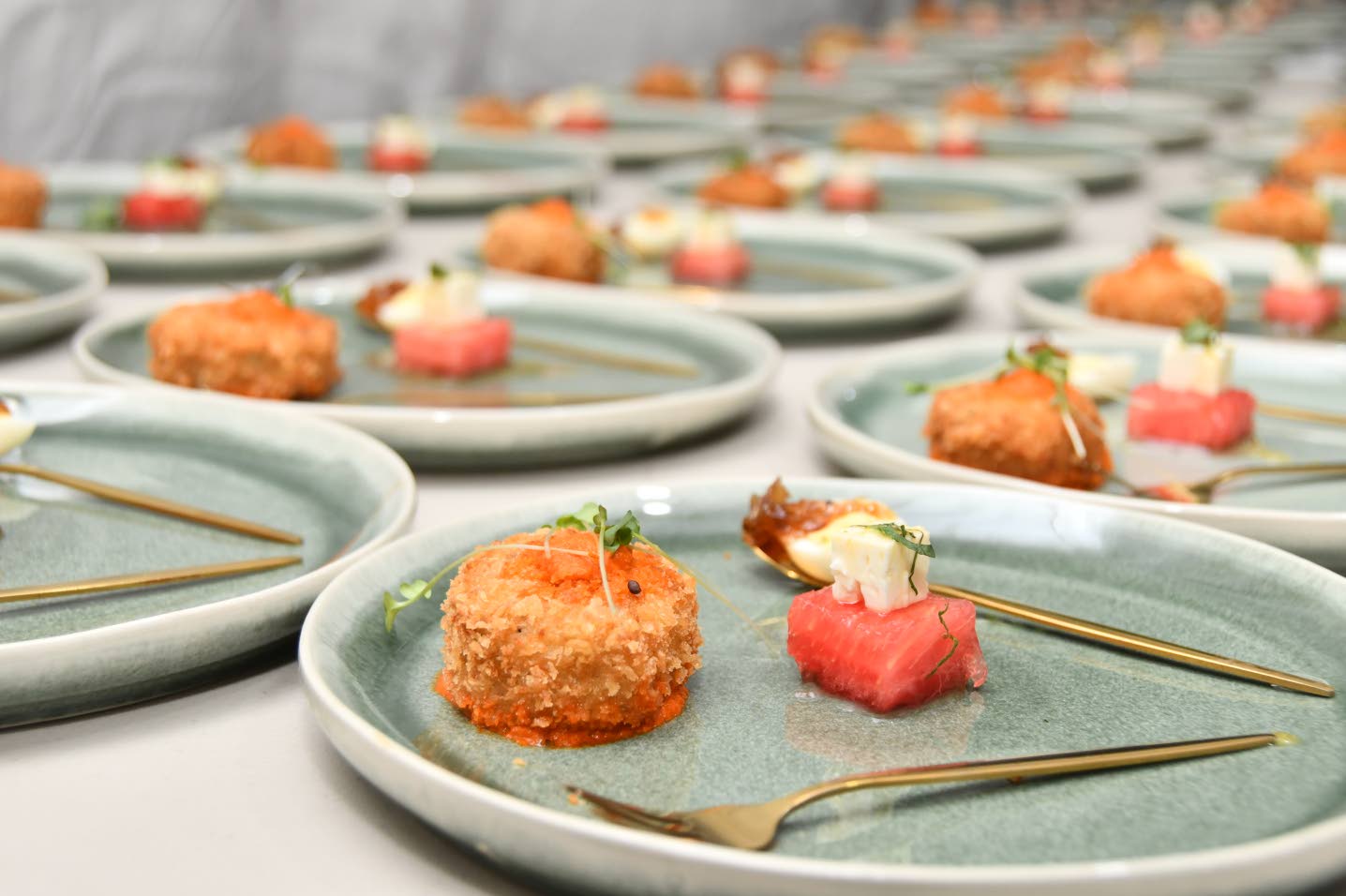 Amuse-bouche: Mini crabcakes, spicy romesco, fresh microgreens salad, fresh watermelon with feta, mint & honey quail egg & caviar spoon with caramelised onion jam (Photo: Naphtali Junior)