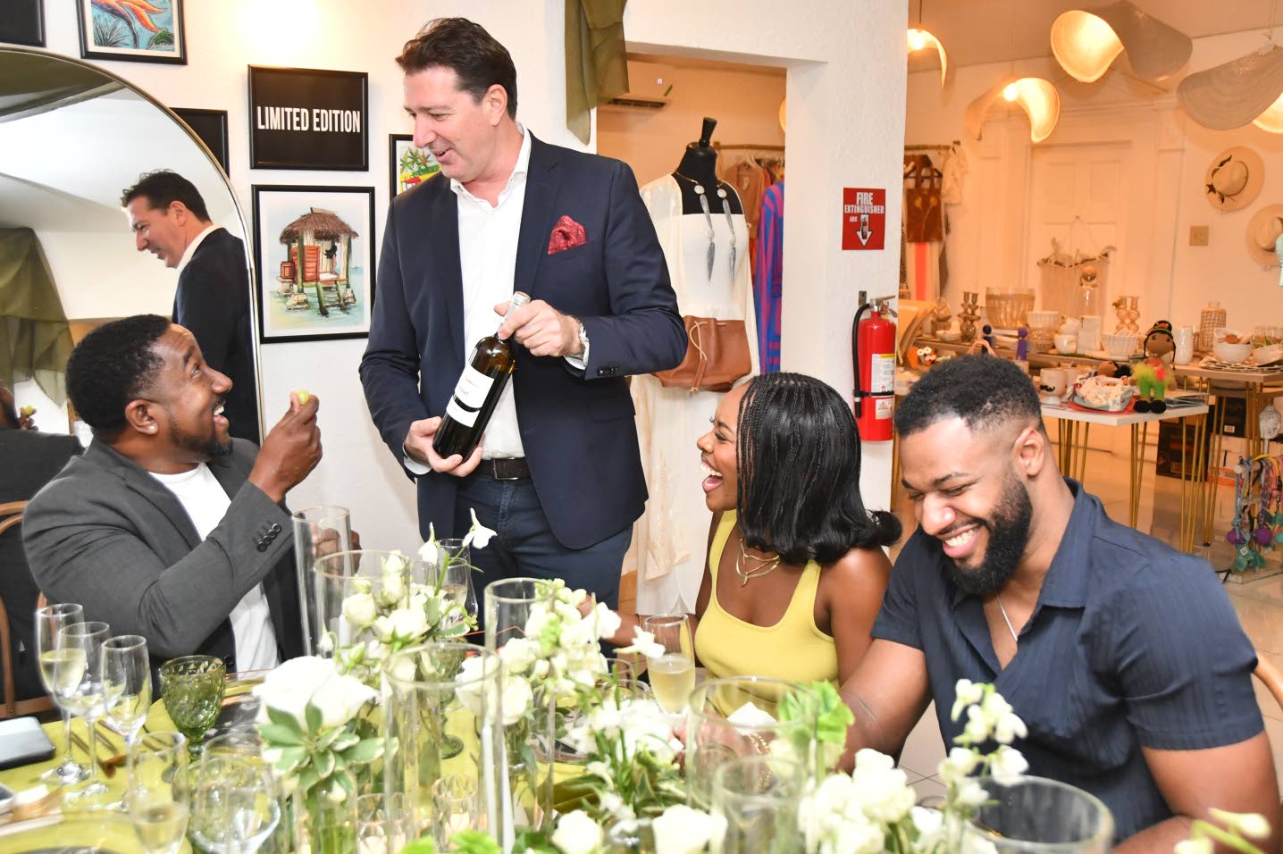 Giowine Area Manager — Caribbean Flavio Andreatta (standing) shared a bottle of Fantinel Cabernet Sauvignon with (from left) CPJ Director of Retail Sales Rojah Thomas; Category Manager for Wines & Water Reina Mshana; and digital creator Andre Skeen, during the sixth course. (Photo: Naphtali Junior)