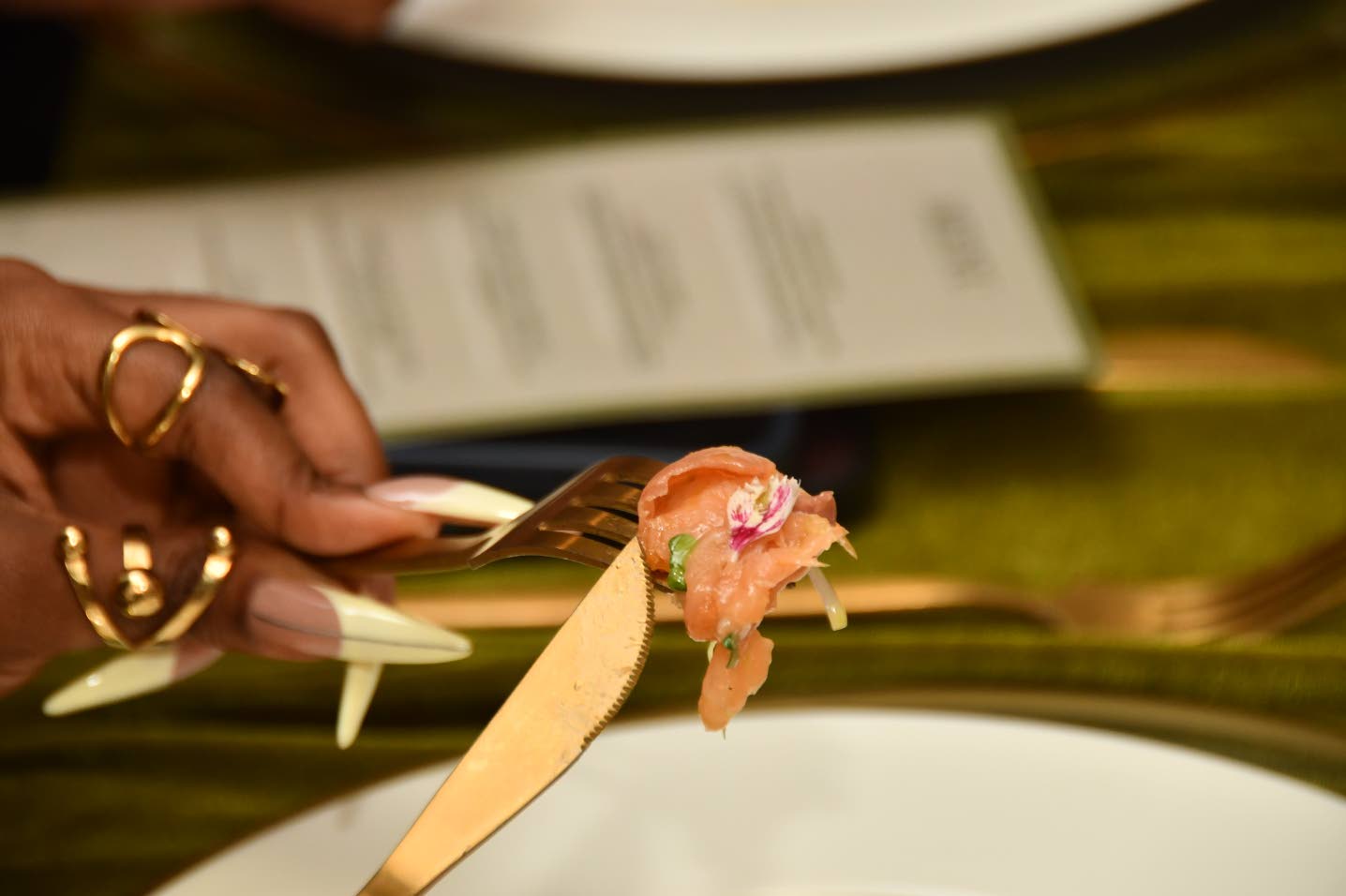 Thursday Food took the opportunity to engage Chef Green during the break. “It is my absolute pleasure to cater this eight-course, wine-paired meal here at Locale, Maison de Vert. We have eight of the most exquisite courses, the first course being a watermelon gazpacho with nice roasted fruits… then we went on to a smoked salmon carpaccio with all the trimmings, mandarin wedges, a microgreen salad, freshly-shaved red onions. Just goodness! And, of course, we had a soup course, a purée of green pea with three cheese tortellini, and butter-poached shrimp. We went on to serve just the most succulent, crispy-skinned sea bass with a nice vegetable succotash. What’s coming now is going to be even more special,” he said.