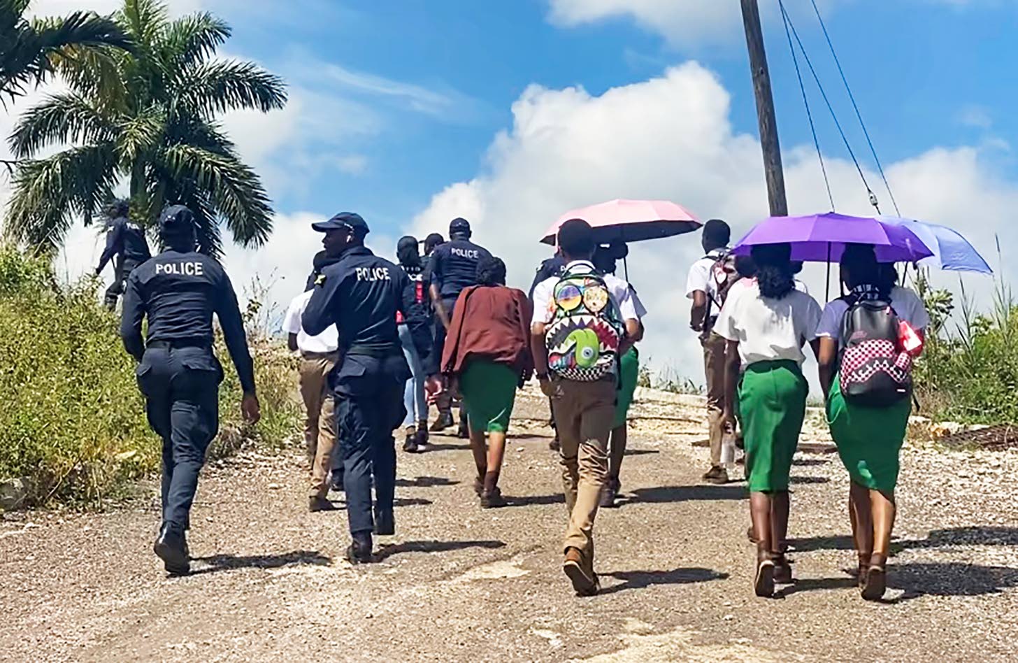 Students and police personnel walk up a hill on Wesley Road in Mandeville on Thursday as the search for missing Manchester High schoolboy Jayden Smith continues. (Photo: Kasey Williams)
