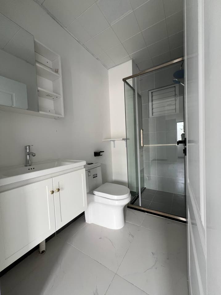 A peek inside the spacious bathroom in one of the apartments that comprise the National Housing Trust’s 245-unit Howard Avenue development.
