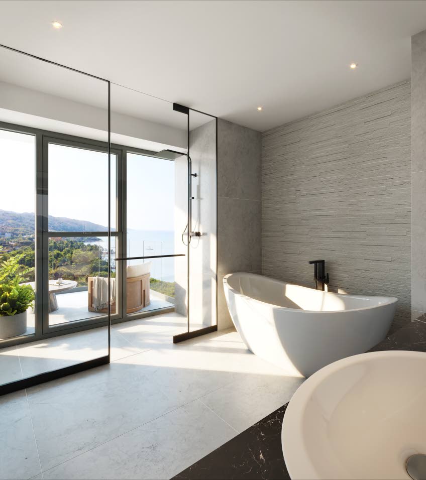 Natural materials — porcelain tiles, textured stone, and woven fibres — anchor the sleek geometry in a distinctly Jamaican sensibility. Interiors are bathed in light, softened by quartz finishes and bespoke metalwork detailing, while terraces extend as outdoor living rooms.