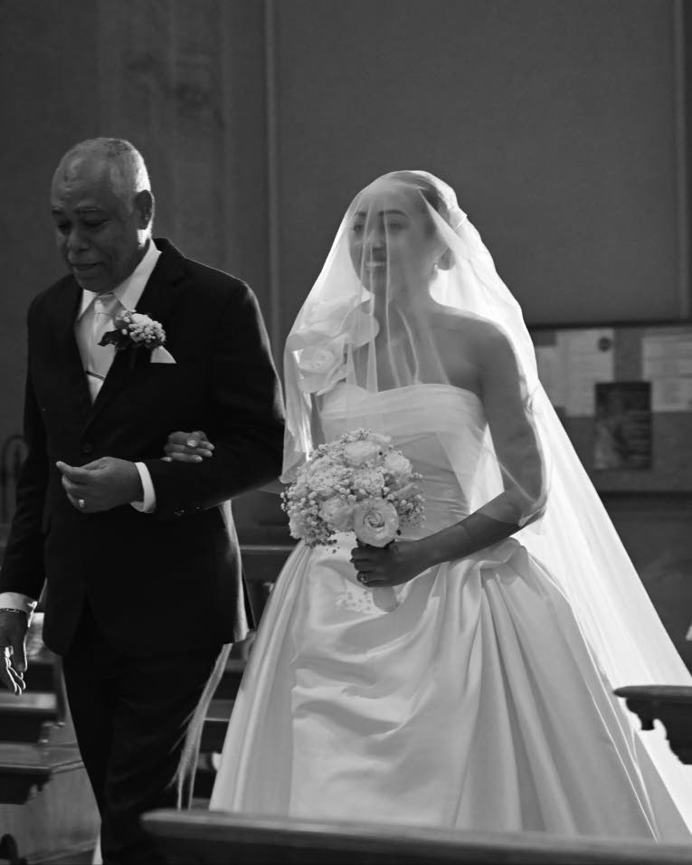 Walking up the aisle on her father Delroy DeSilva’s arm, the bride was radiant in a satin gown with floral appliqué details by designer Pen Liv. The church resounded with a classic organ rendition of Felix Mendelssohn’s Wedding March, setting the scene for a timeless moment.