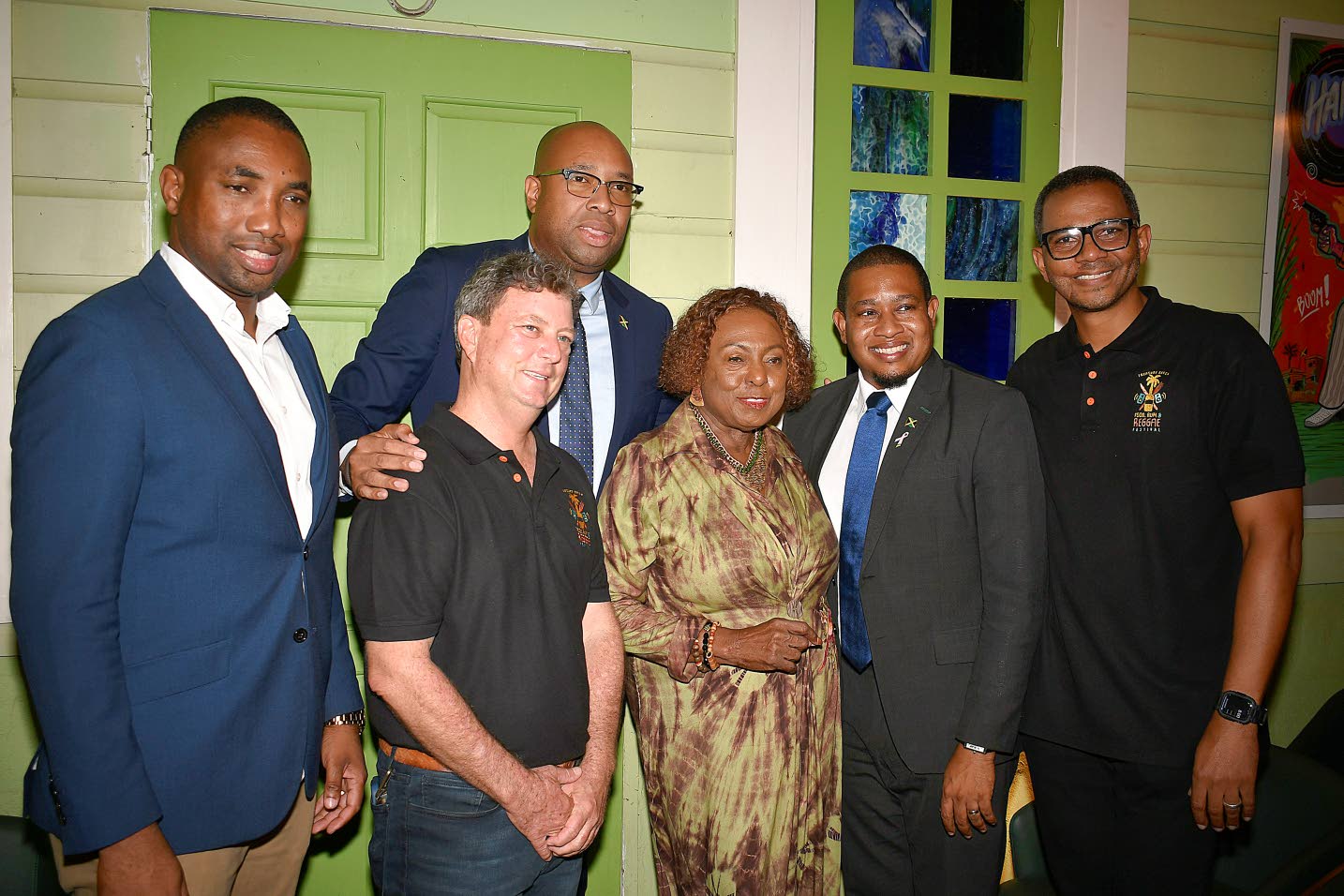 From left: Omar Frith, chairman of the CHASE Fund; Jason Henzell, festival co-director; Delano Seiveright, minister of state in the Ministry of Industry, Commerce and Investment; Olivia Grange, minister of entertainment and culture; Floyd Green, minister of agriculture, fisheries and mining; and festival co-director Gregory Wright all pause for a photo op at the festival’s media launch on Tuesday night. (Photo: Karl Mclarty)