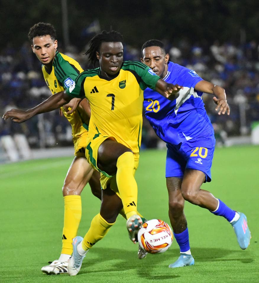 Tyreece Campbell (centre) of Jamaica gets to the ball ahead of teammate Ian Fray (left) and Joshua Brenet of Curacao during the Fifa World Cup Qualifier at Ergilio Hato Stadium in Willemstad on Friday, October 10, 2025. (Photo: Naphtali Junior)
