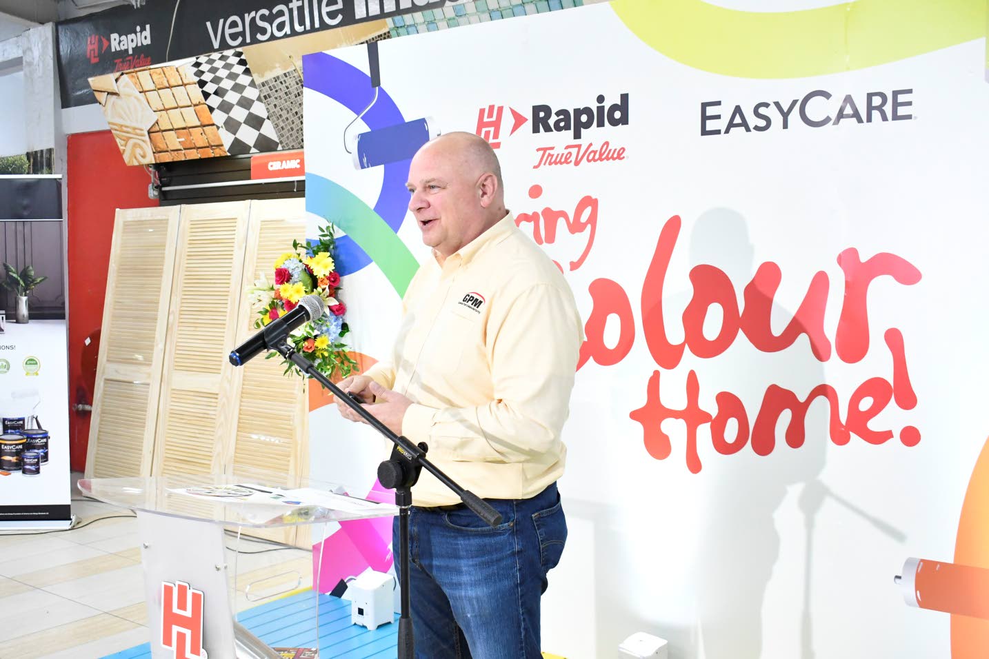 Taking the stage, True Value International Sales Manager Steve Terpstra presented the comprehensive benefits of the products under the EasyCare Premium Paints portfolio. (Photo: Karl Mclarty)