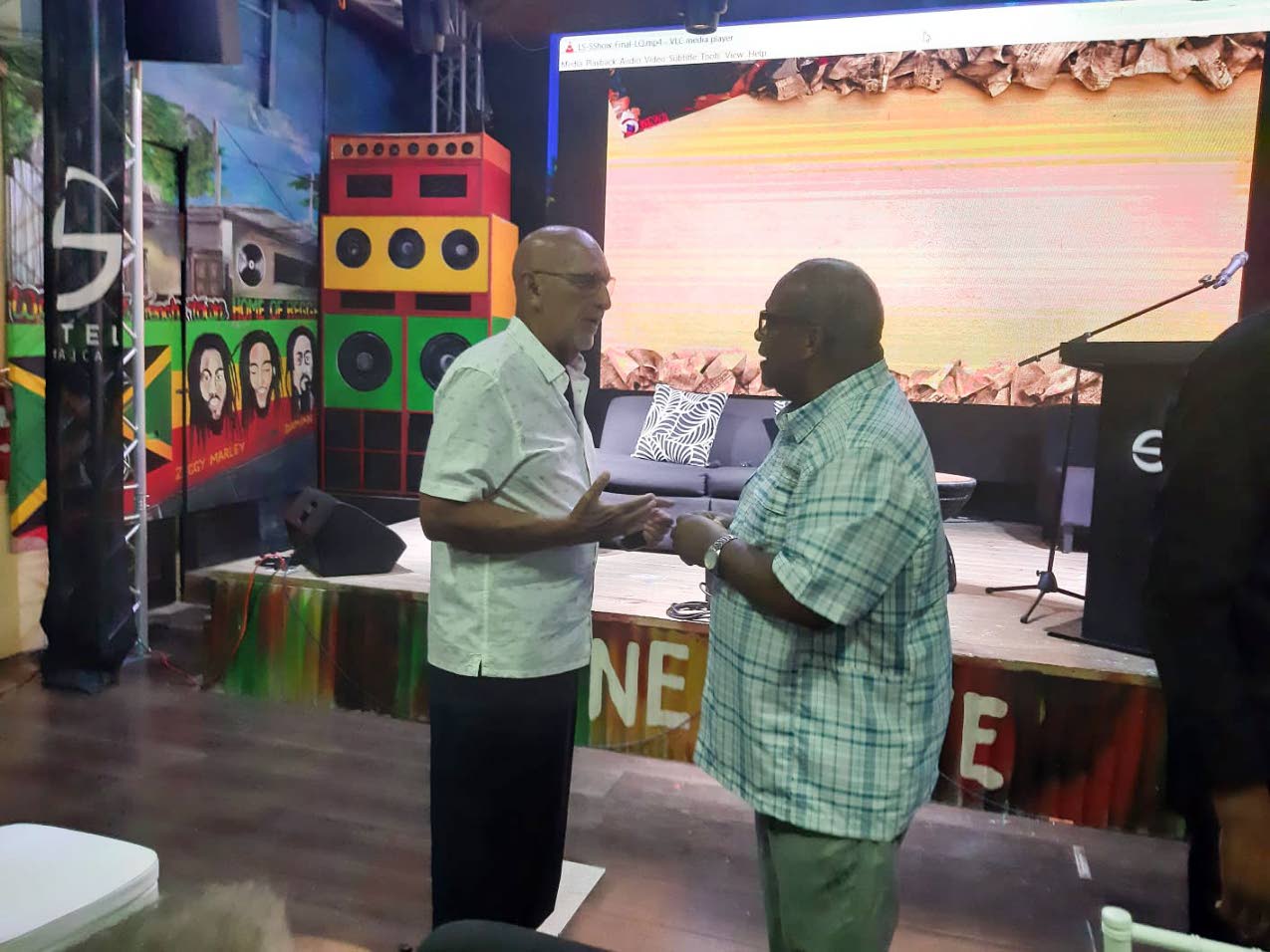 Former senator and Montego Bay businessman Noel Sloley (left) in conversation with Lloyd B Smith before the start of Sunday’s celebration to mark Smith’s 50 years in media. (Photo: Charmaine Clarke)