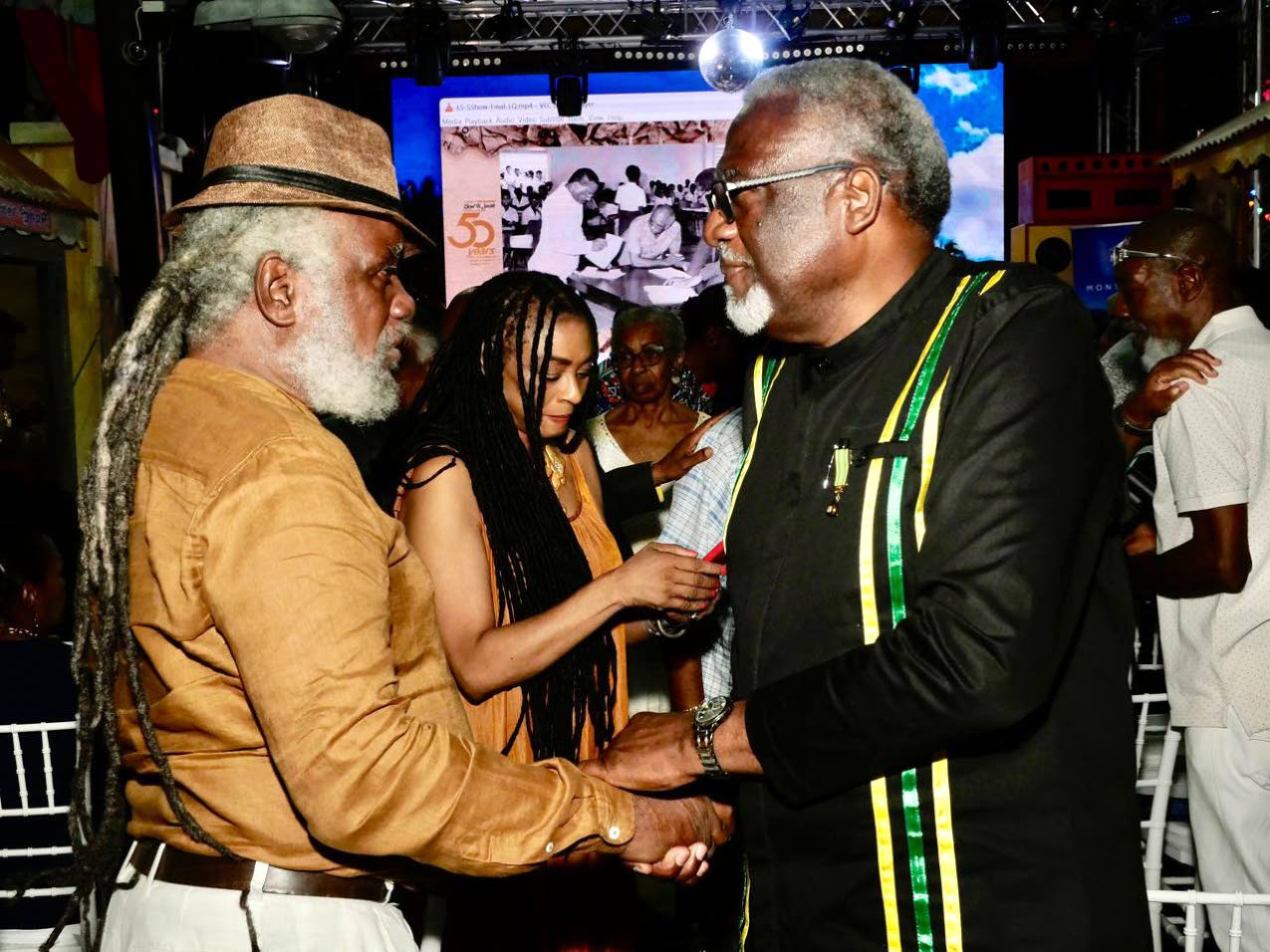 Custos of St James Reverend Conrad Pitkin (right) exchanges pleasantries with social activist O Dave Allen during a celebration of Lloyd B Smith’s 50 years in media at S Hotel in Montego Bay on Sunday evening. (Photo: Philp Lemonte)