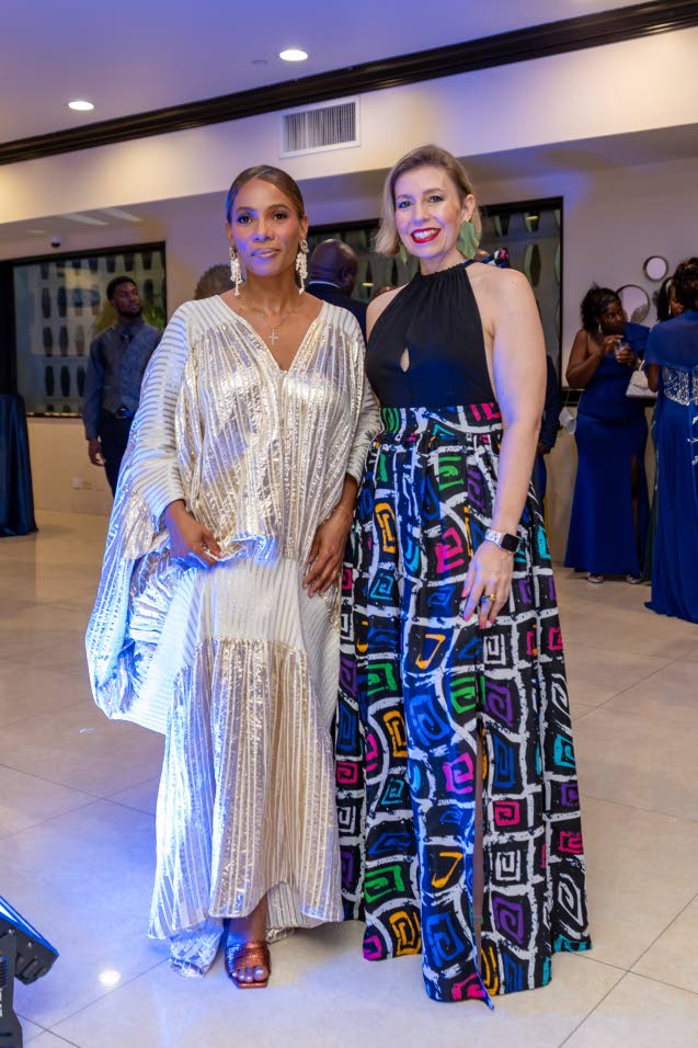 Event designer Aiesha Panton (left) dazzled in a metallic number, while Jamaica Manufacturers & Exporters Association President Kathryn Silvera embraces elegance in print.Jermaine