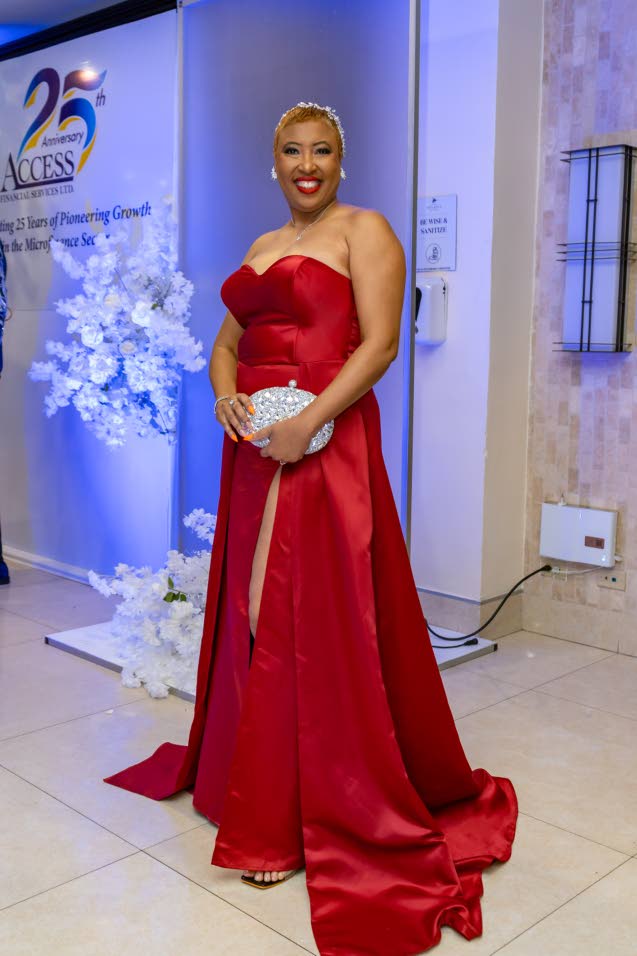AFS Kingston Branch Manager Michelle Campbell Ellington makes a statement in a bold red gown with a flowing silhouette.Jermaine