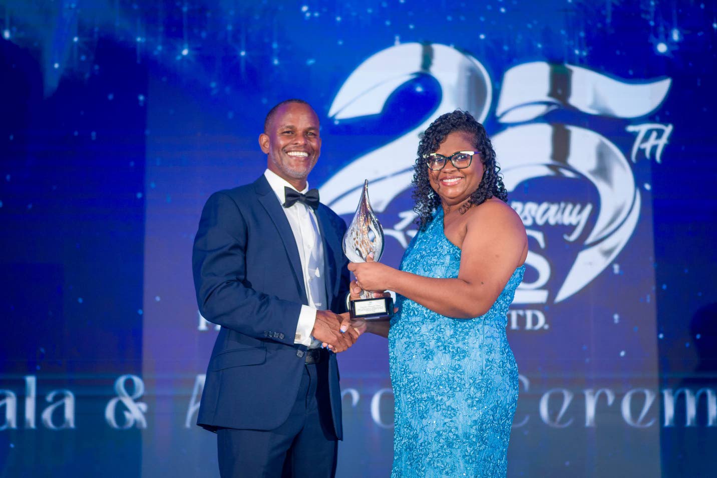Access Financial Services founder & Executive Director Marcus James (left) presents a Long Service Award to Terry-Ann Bisnaught-Spence, risk officer in the operations and credit department, for almost 24 years of distinguished service to the business. Rahyme McKenzie