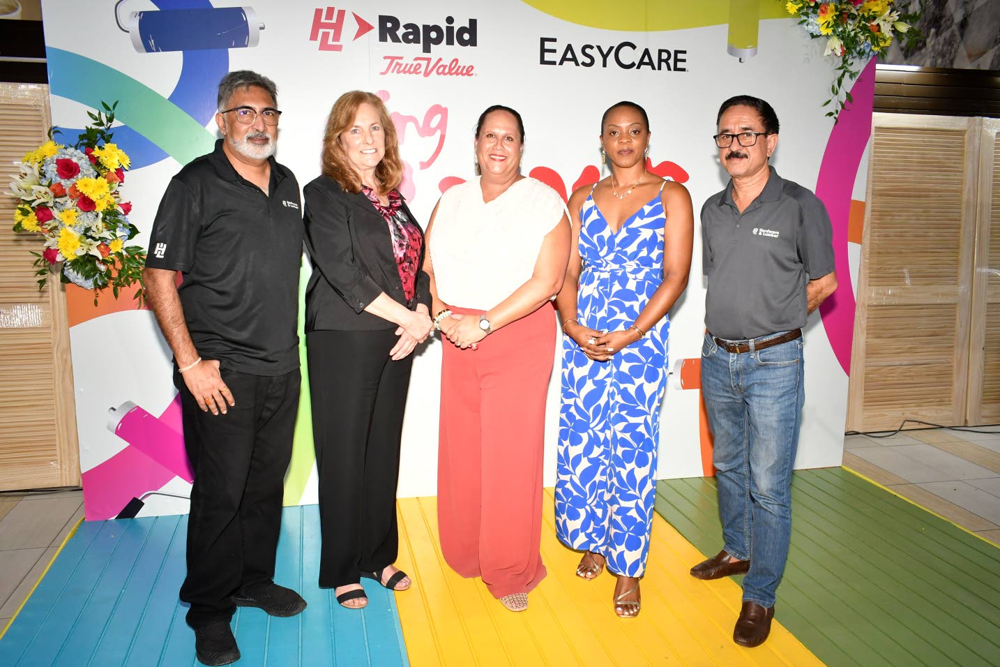 Colour specialist Dawn Garrett (second left) enjoyed a moment with (from left) H&L Group CEO Sudhakar Ramani; Chief Category Officer Annelies Denny; General Manager Pamille Shaw-Blair; and Chief Operating Officer Anurag Khajuria, ahead of the formalities. (Photo: Karl Mclarty)