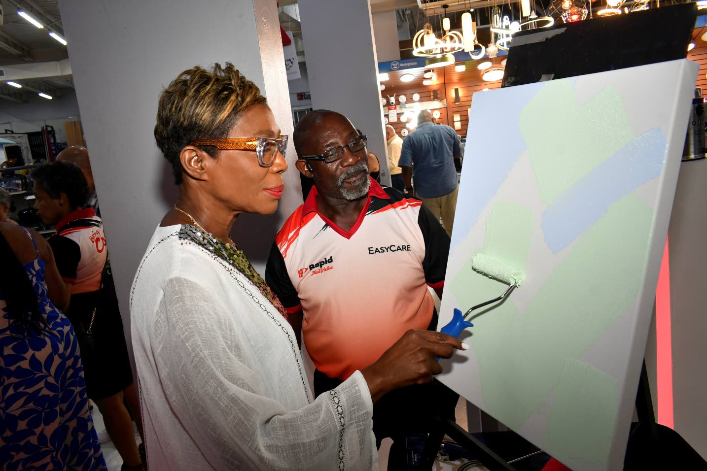 Visual artist Pamella Chen flexed her skills at the paint station, under the watchful eye of Senior Paint Promoter Cornell Drummond. (Photo: Karl Mclarty)