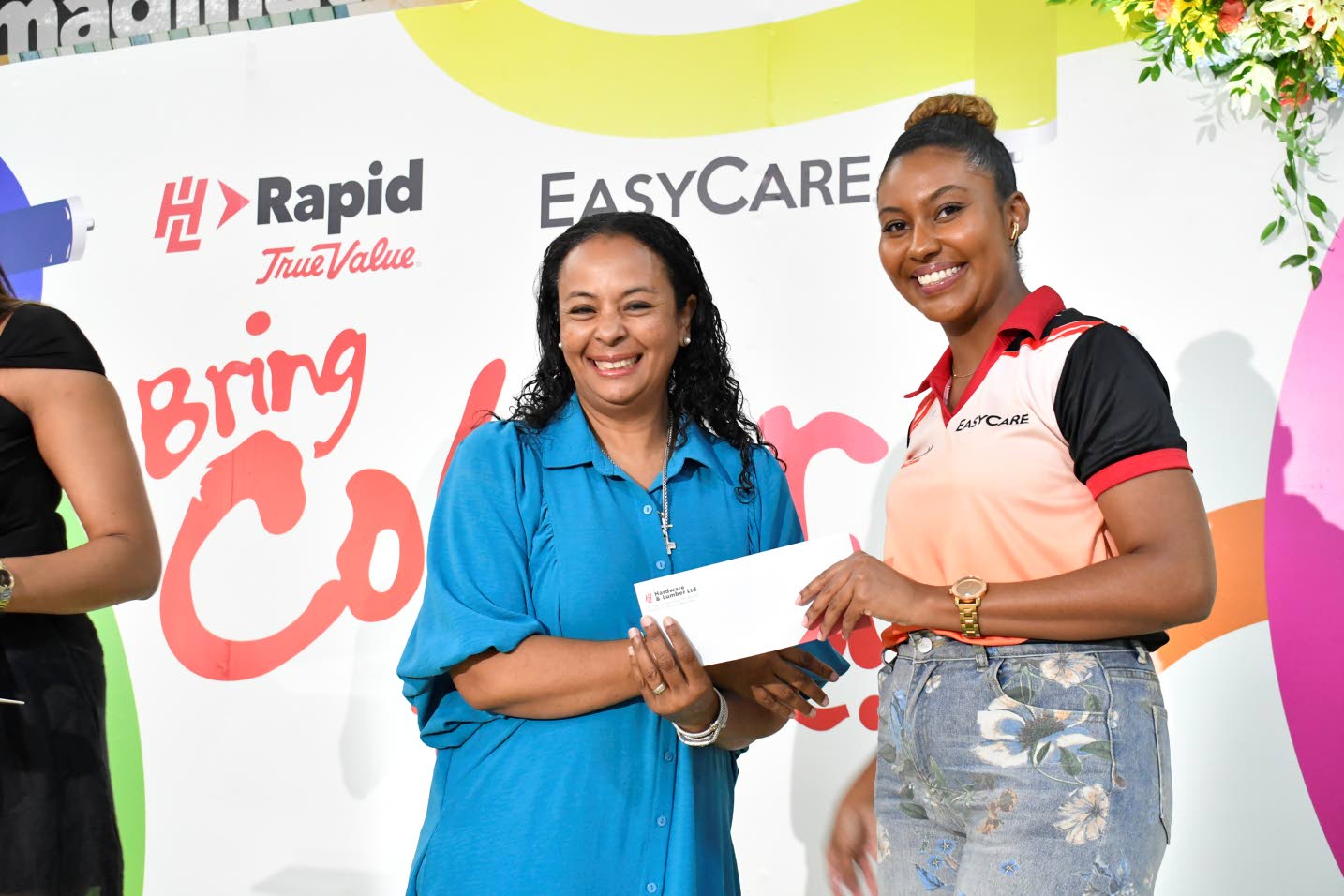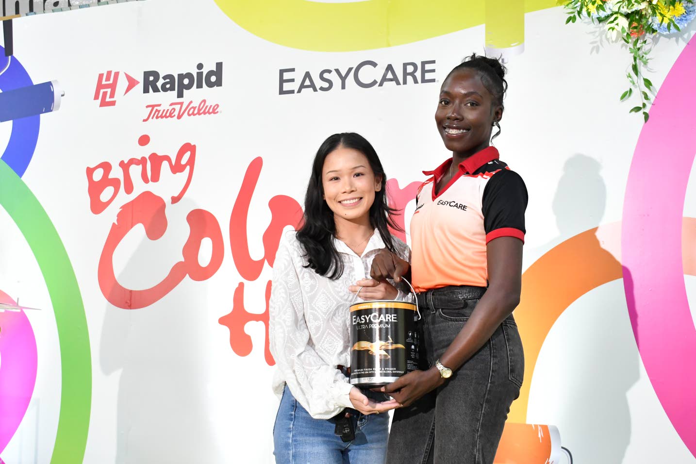 (From left) Interior designer Tianna Yip’s colour knowledge won her a gallon of EasyCare Premium Paint, presented by H&L Marketing Associate Tameka Kennedy. (Photo: Karl Mclarty)