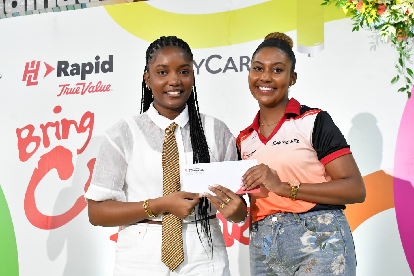 Interior designer Jodene Ferguson (left) hit the jackpot, capturing the grand prize of a customisable bar counter courtesy of H&L. Making the symbolic presentation was Hardware and Lumber Limited Brand Manager Amber Dennis. (Photo: Karl Mclarty)