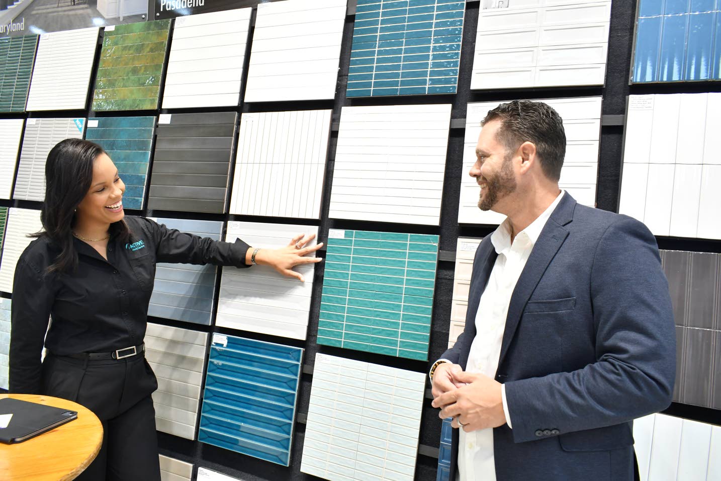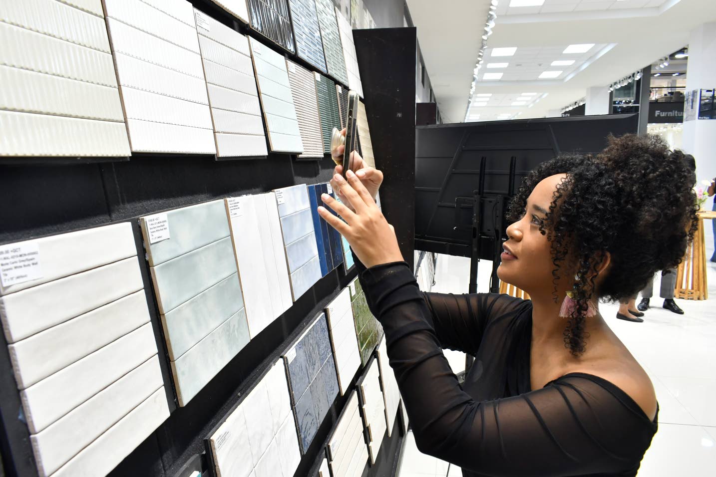 Active Home Centre marketing executive Brittany Warren introduced Active’s large-format tiles to Senator Christian Tavares-Finson. (Photo: Karl Mclarty)