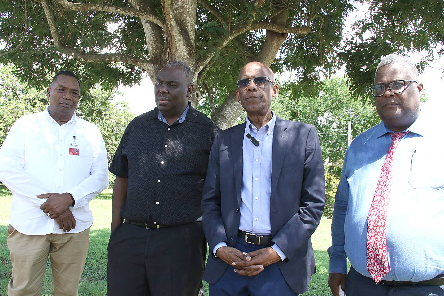 UWI, Mona campus administrators (from left) Marlon Nesbeth, director of security; Donovan Stanberry, campus registrar; Tomlin Paul,campus deputy principal; and Peter Clegg, legal officer, outside the hall where a student’s body was found on Thursday, October 16. (Photo: Llewellyn Wynter)