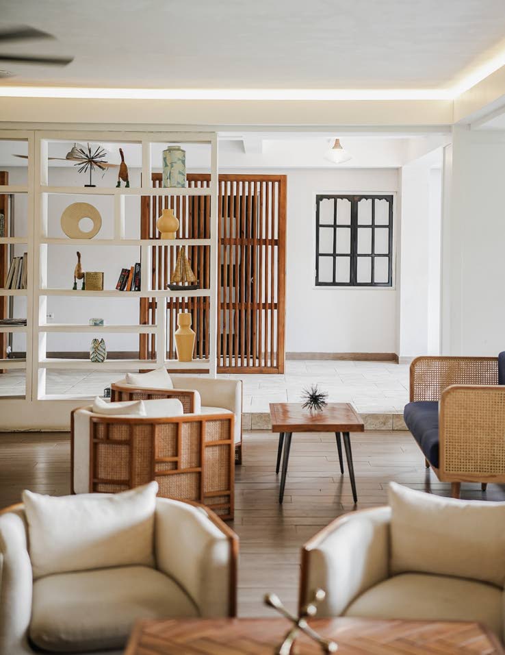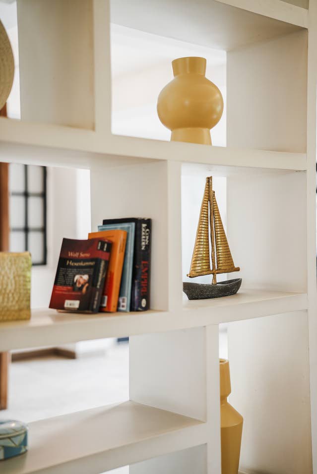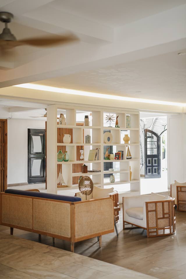 The design embraces an open floor plan anchored by a feature shelving unit that doubles as an architectural divider. Rather than solid walls, this airy installation allows light to pass through, maintaining sightlines across the lobby while displaying carefully curated objects.