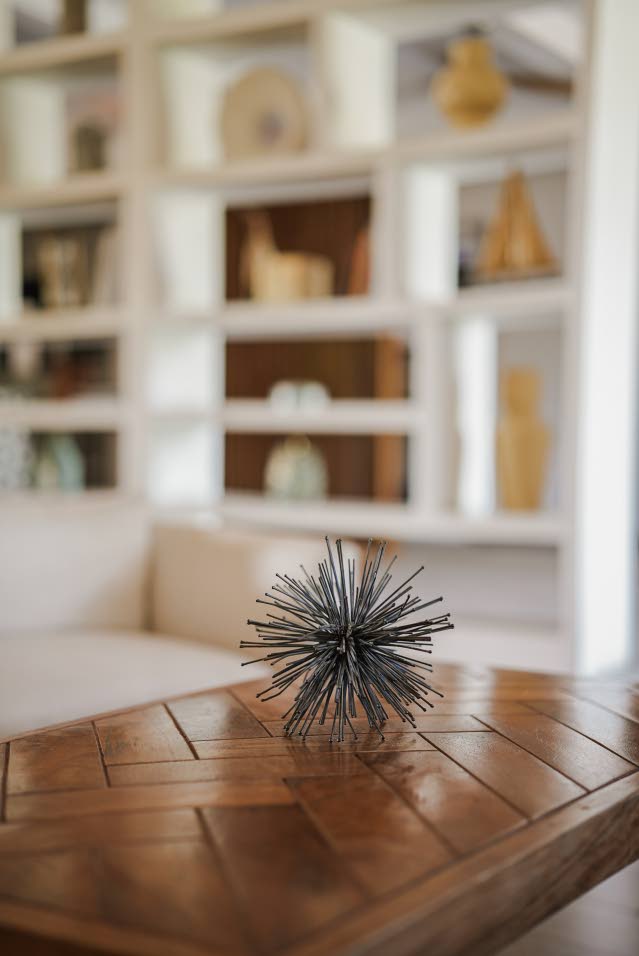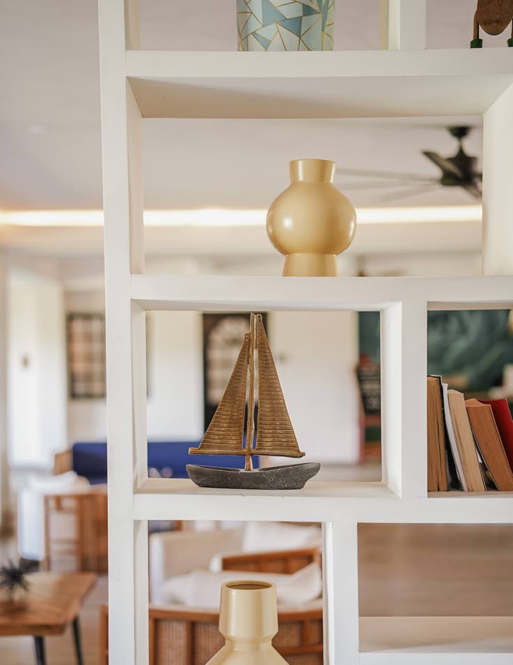 Coffee and side tables, each with mid-century–inspired legs, balance the seating layout and add a modern twist. A recurring motif is the metallic “starburst,” placed atop tables reminiscent of sea urchins found along Jamaica’s shores — playful reminders of the natural world that inspires relaxation.
