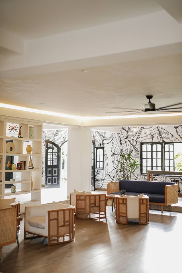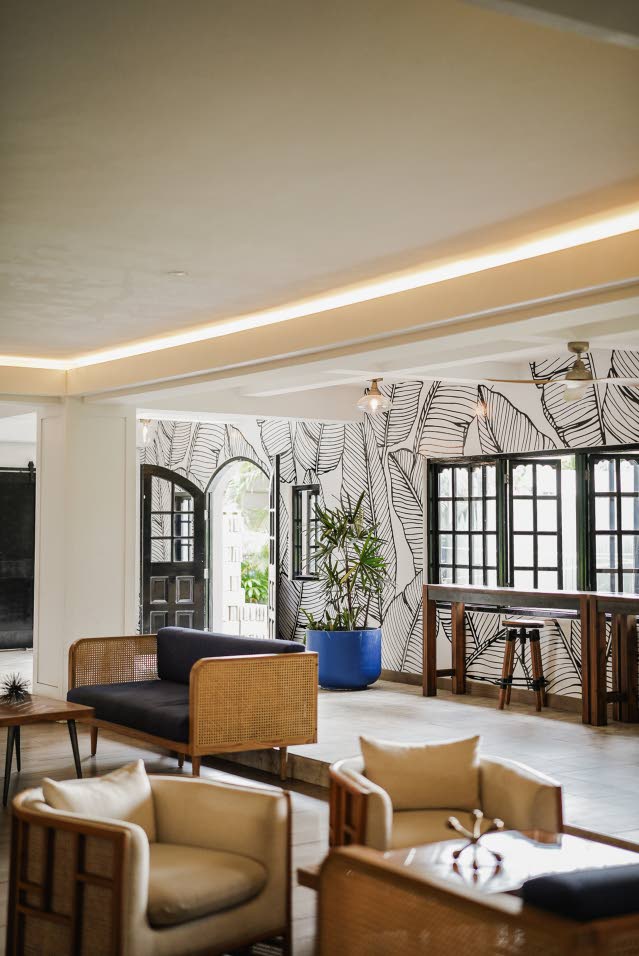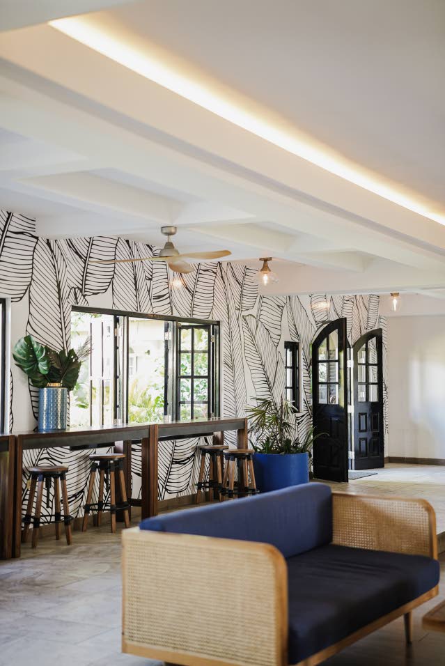 The accent wall blends modern design and nature. A bold, monochromatic mural of oversized leaves anchors one side of the lobby, energising the space without overwhelming it. This black-and-white backdrop contrasts beautifully with the warmth of rattan furniture and the vibrancy of potted plants set in deep blue concrete planters.