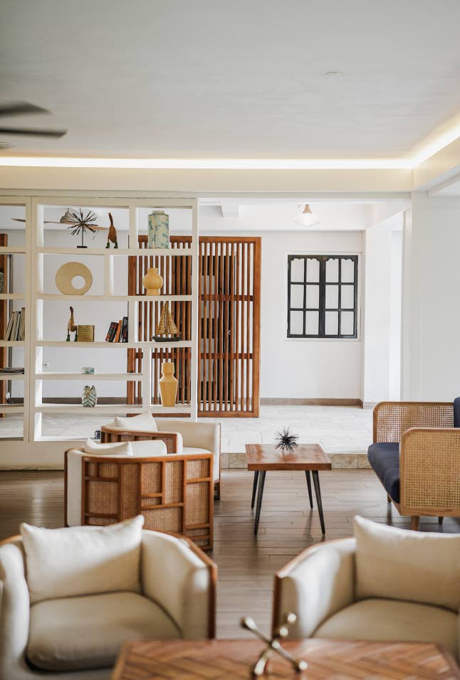 Open shelving and floating wooden slats act as room dividers that separate administrative offices from the lobby (Photo: Riane Bawalan Studios)